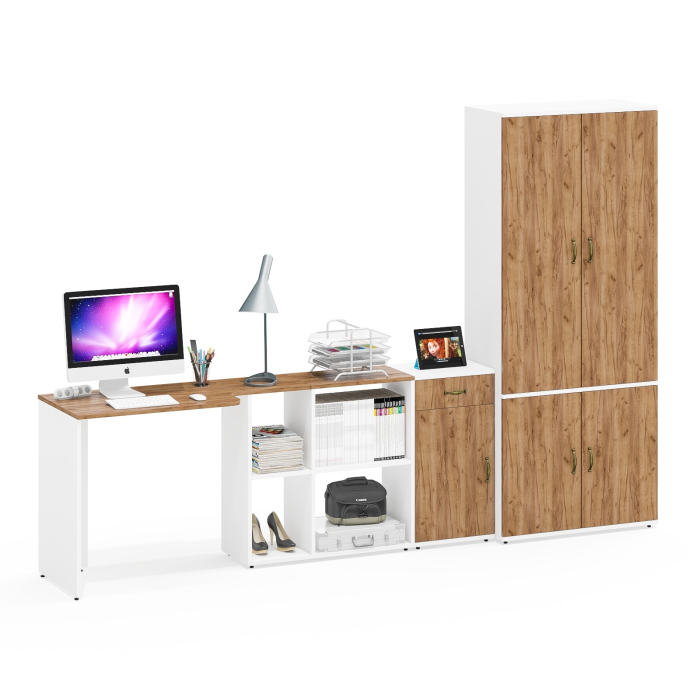Стол-трансформер СтТ предлагает два варианта сборки - угловой (115х50/80х75 см) или прямой (165х50/30х75 см), что позволяет оптимально использовать доступное пространство. Встроенная тумба стола с четырьмя полками обеспечивает удобное хранение документов и канцелярских принадлежностей. Тумба 3.15 с выдвижным ящиком сверху и дверкой является решением для размещения различных мелочей. Ящик оснащен шариковыми направляющими неполного выдвижения. Шкаф Ш20Б состоит из двух отделений за распашными дверками. Верхнее отделение - слева – выдвижная штанга, что экономит пространство и облегчает доступ, справа – три полки и открытая ниша снизу, идеально подходящие для хранения аксессуаров, обуви, сумок или декоративных элементов. Нижнее отделение оснащено полкой по центру вещей. Справа – три полки и открытая ниша, подходящие для хранения аксессуаров, обуви, сумок или декоративных элементов. Нижнее отделение оснащено полкой по центру.