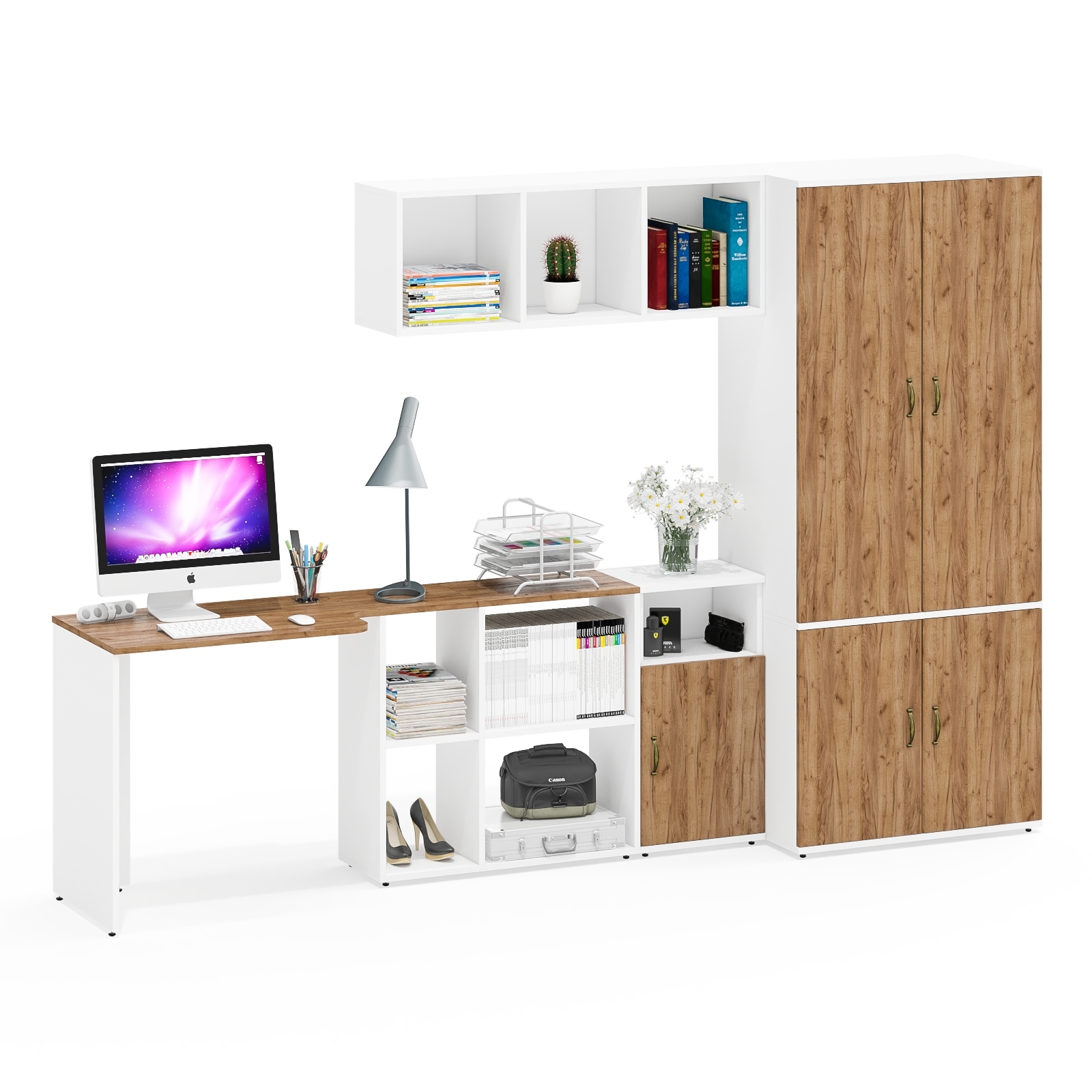 Комплектация состоит из стола-трансформера Лидер-8 СтТ, полки Лидер-8 Плк, тумбы с нишей и дверкой Лидер-8 3.19 и шкафа глубокого со штангой и полкой Лидер-8 Ш19Б.