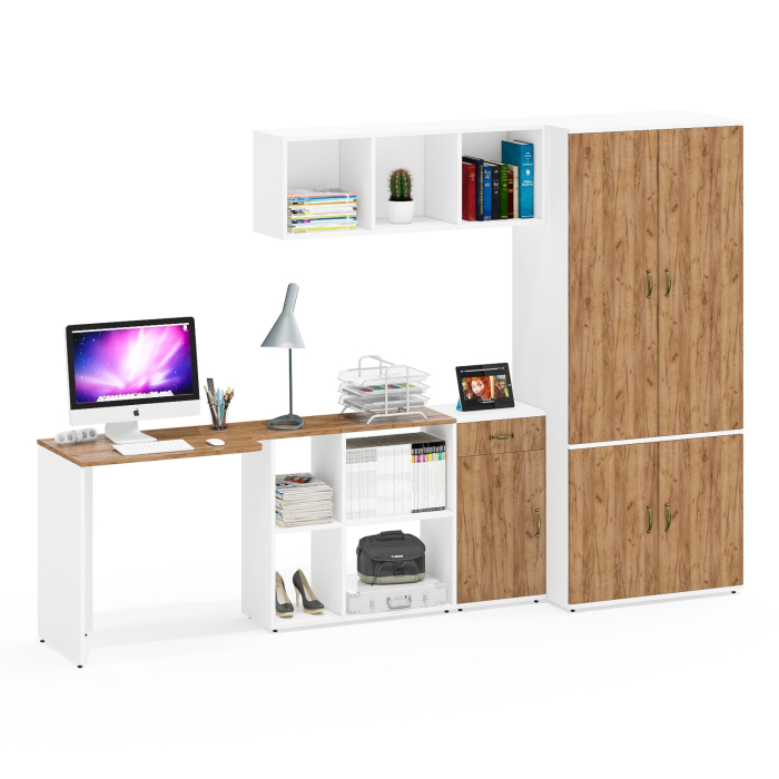 Стол-трансформер СтТ предлагает два варианта сборки - угловой (115х50/80х75 см) или прямой (165х50/30х75 см), что позволяет оптимально использовать доступное пространство. Встроенная тумба стола с четырьмя полками обеспечивает удобное хранение документов и канцелярских принадлежностей. Классическая открытая навесная полка. Разделена на 3 отделения вертикальными перегородками. Навесная полка может крепиться горизонтально или вертикально. Тумба 3.15 с выдвижным ящиком сверху и дверкой является решением для размещения различных мелочей. Ящик оснащен шариковыми направляющими неполного выдвижения. Шкаф Ш19Б состоит из двух отделений за двумя распашными дверками каждое. Верхнее отделение оснащено горизонтальной штангой для одежды на плечиках. Нижнее отделение с полкой по центру. Глубина шкафа 50 см позволяет удобно размещать одежду и другие предметы.