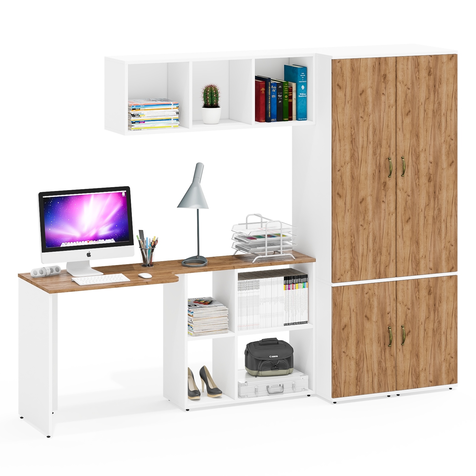 Стол-трансформер СтТ предлагает два варианта сборки - угловой (115х50/80х75 см) или прямой (165х50/30х75 см), что позволяет оптимально использовать доступное пространство. Встроенная тумба стола с четырьмя полками обеспечивает удобное хранение документов и канцелярских принадлежностей. Классическая открытая навесная полка. Разделена на 3 отделения вертикальными перегородками. Навесная полка может крепиться горизонтально или вертикально. Каждый Пенал П23Б глубиной 50 см имеет два отделения - верхнее с горизонтальной штангой и нижнее с полкой за дверкой.