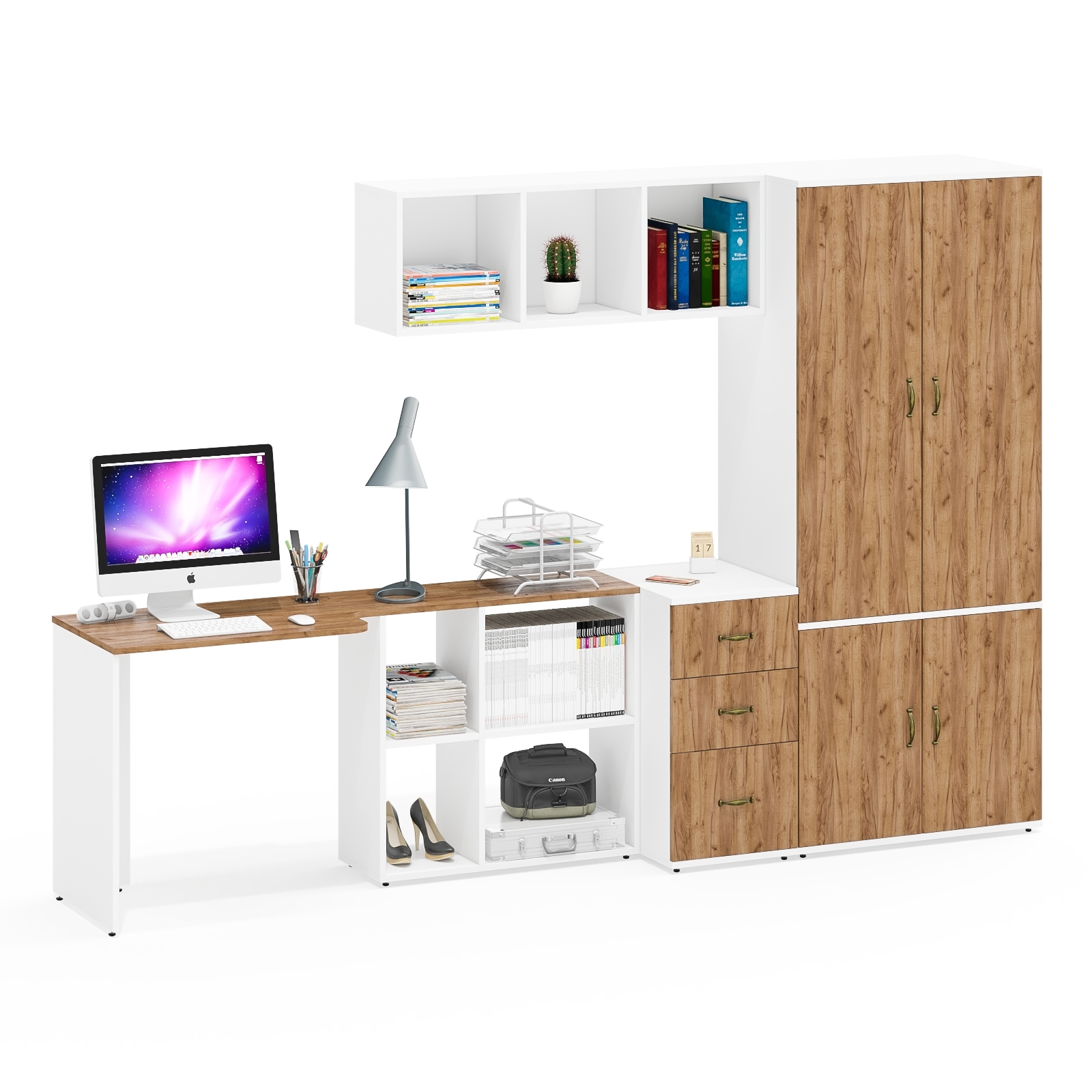 Комплектация состоит из стола-трансформера Лидер-8 СтТ, полки Лидер-8 Плк, тумбы с тремя ящиками Лидер-8 3.16 и шкафа глубокого со штангой и полкой Лидер-8 Ш19Б.