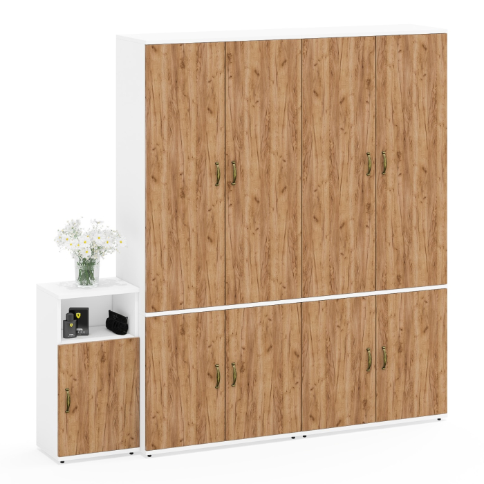 Каждый шкаф Ш20Б состоит из двух отделений. Верхнее отделение у каждого шкафа разделено на две зоны, слева – выдвижная штанга , что экономит пространство и облегчает доступ. Справа – три полки и открытая ниша снизу, подходящие для хранения аксессуаров, обуви, сумок или декоративных элементов. Нижнее отделение оснащено полкой по центру. Тумба 3.19 оборудована открытой нишей сверху и отделением с полкой за распашной дверкой. В данной модели шкафа нет универсальной сборки. Сторону открывания двери тумбы вы определяете при сборке.