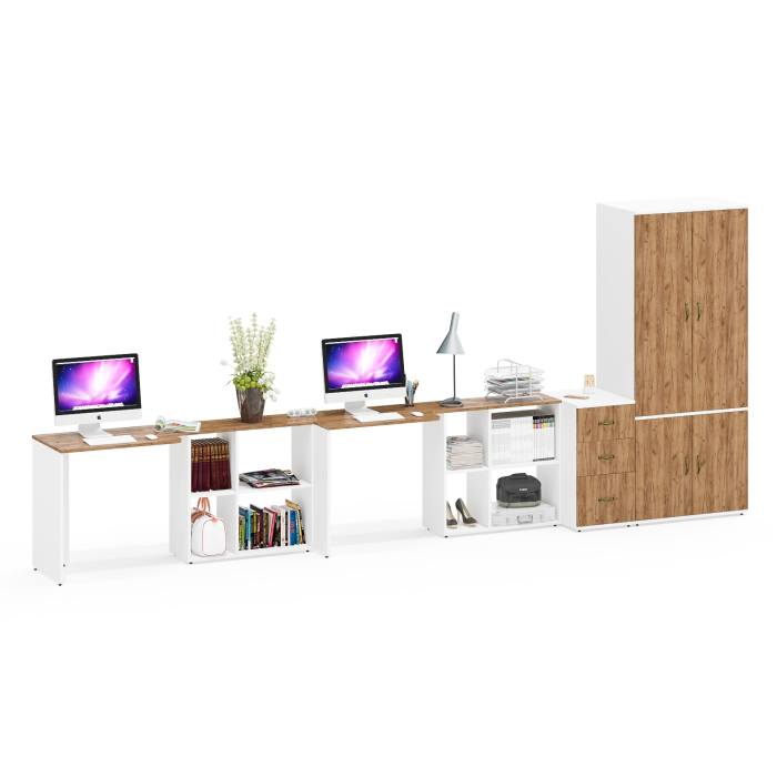 Комплектация состоит из двух столов-трансформеров Лидер-8 СтТ, шкафа Ш19Б и тумбы с тремя ящиками Лидер-8 3.16.