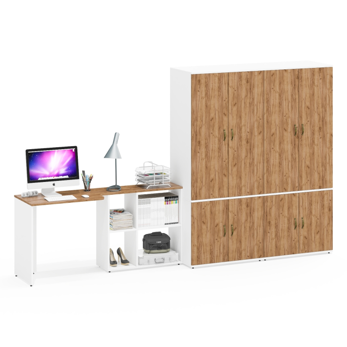 Стол-трансформер СтТ предлагает два варианта сборки - угловой (115х50/80х75 см) или прямой (165х50/30х75 см), что позволяет оптимально использовать доступное пространство. Встроенная тумба стола с четырьмя полками обеспечивает удобное хранение документов и канцелярских принадлежностей. Каждый Шкаф Ш19Б состоит из двух отделений за двумя распашными дверками каждое. Верхнее отделение оснащено горизонтальной штангой для одежды на плечиках. Нижнее отделение с полкой по центру. Глубина шкафа 50 см позволяет удобно размещать одежду и другие предметы.