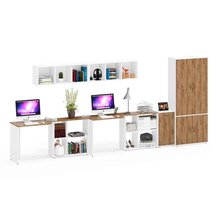 Комплектация состоит из двух столов-трансформеров Лидер-8 СтТ, двух полок Лидер-8 Пнл, шкафа Лидер-8 Ш20Б и тумбы с ящиком и дверкой Лидер-8 3.15.