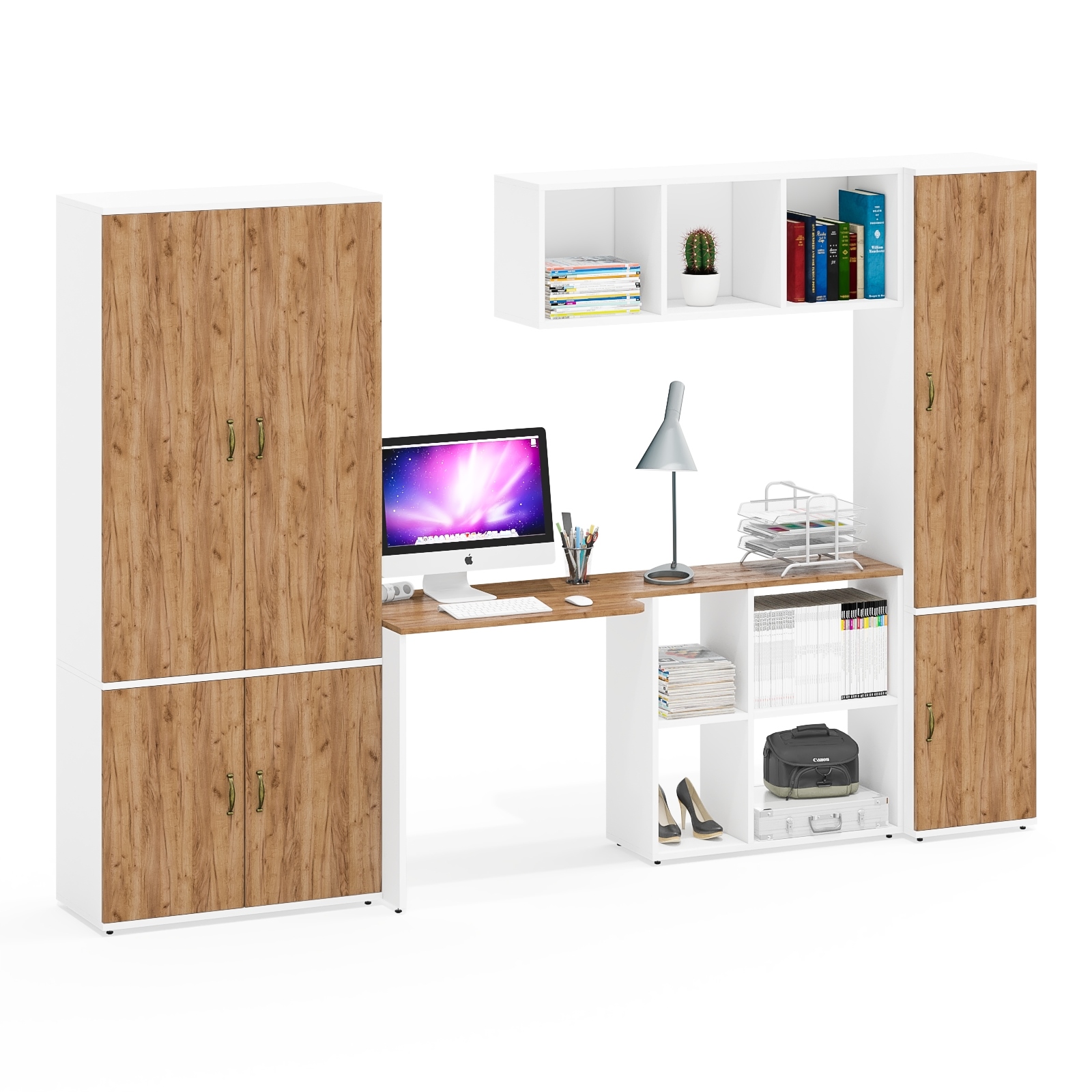 Стол-трансформер СтТ предлагает два варианта сборки - угловой (115х50/80х75 см) или прямой (165х50/30х75 см), что позволяет оптимально использовать доступное пространство. Встроенная тумба стола с четырьмя полками обеспечивает удобное хранение документов и канцелярских принадлежностей. Классическая открытая навесная полка. Разделена на 3 отделения вертикальными перегородками. Навесная полка может крепиться горизонтально или вертикально. Шкаф Ш20Б состоит из двух отделений за распашными дыерками. Верхнее отделение - слева – выдвижная штанга, что экономит пространство и облегчает доступ, справа – три полки и открытая ниша снизу, идеально подходящие для хранения аксессуаров, обуви, сумок или декоративных элементов. Нижнее отделение оснащено полкой по центру вещей. Справа – три полки и открытая ниша снизу, подходящие для хранения аксессуаров, обуви, сумок или декоративных элементов. Нижнее отделение оснащено полкой по центру. Пенал П23Б глубиной 50 см имеет два отделения - верхнее с горизонтальной штангой и нижнее с полкой за дверкой. Пенал П22Б с двумя дверками и пятью полками идеально подходит для систематичного размещения книг, документов, аксессуаров или предметов декора.