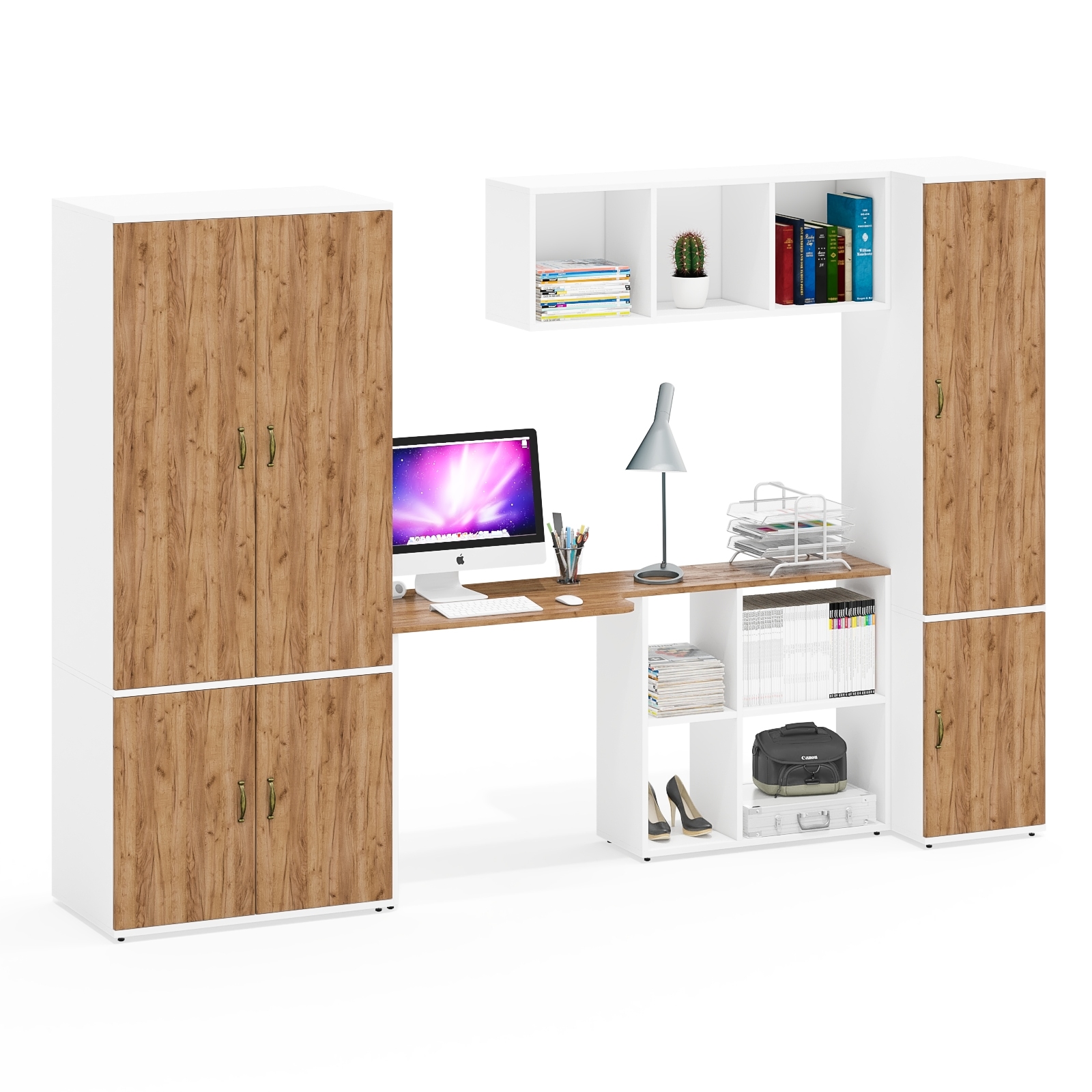 Комплектация состоит из стола-трансформера Лидер-8 СтТ, полки Лидер-8 Плк, шкафа глубокого со штангой и полкой Лидер-8 Ш19Б и пенала глубокого Лидер-8 П23Б.