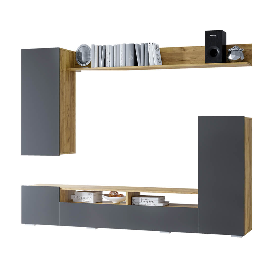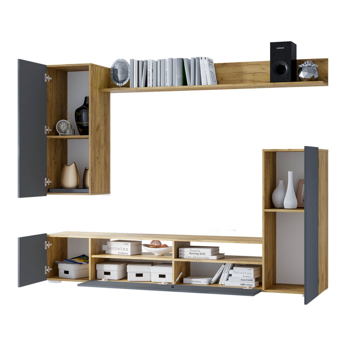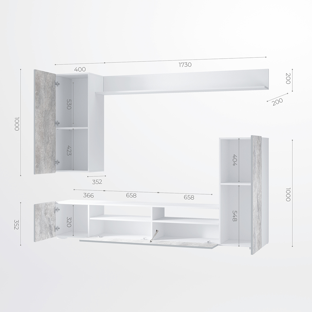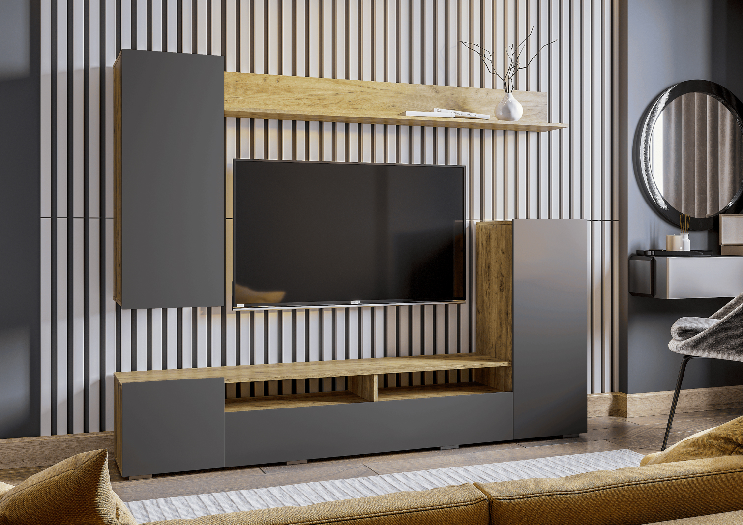 Створки открываются путем захвата фасада сверху или снизу. Декоративная панель с открытыми полками позволит Вам расположить телевизор и другую технику, а также расставить предметы декора.