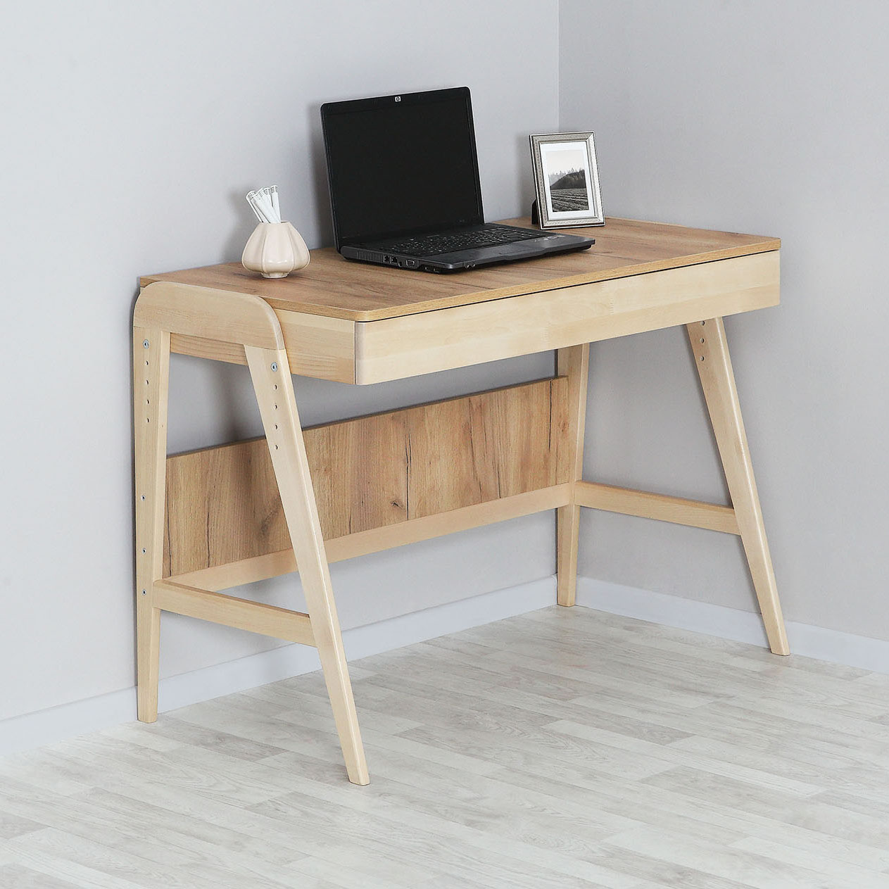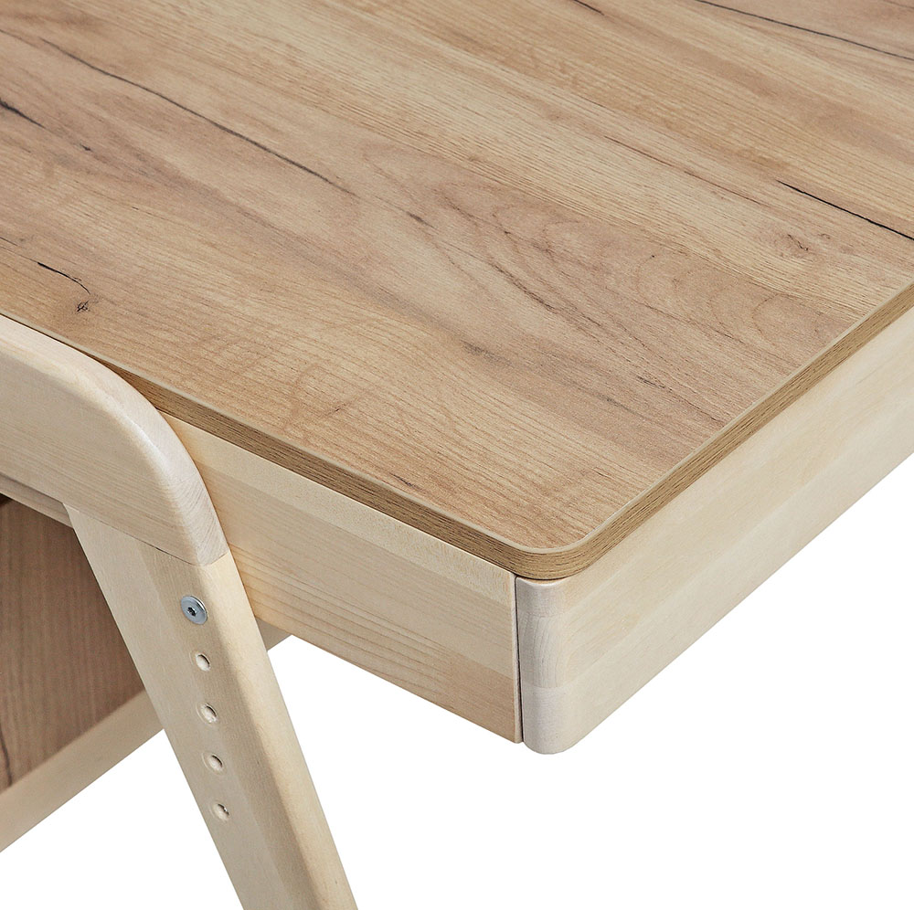 Каркас из массива березы, покрытый бесцветным лаком; Столешница и задняя стенка ЛДСП, Безопасные скругленные углы; Торцы столешницы обработаны кромкой ПВХ 2 мм; Вместительный выдвижной ящик на телескопических направляющих, которые обеспечивают полное и плавное открывание; Регулируемая высота столешний; Стол регулиется по высоте(столешница может устанавливаться в 5-ти положениях)