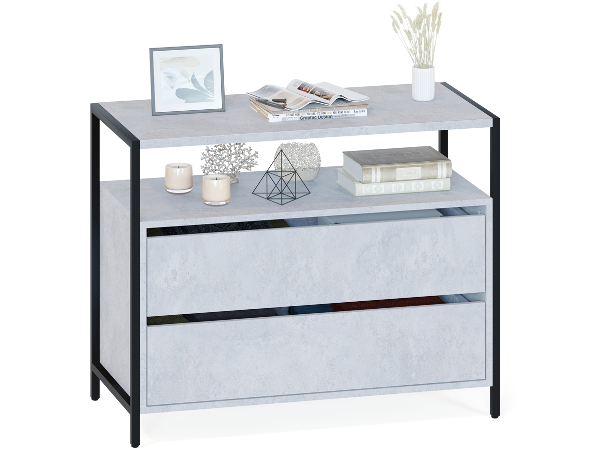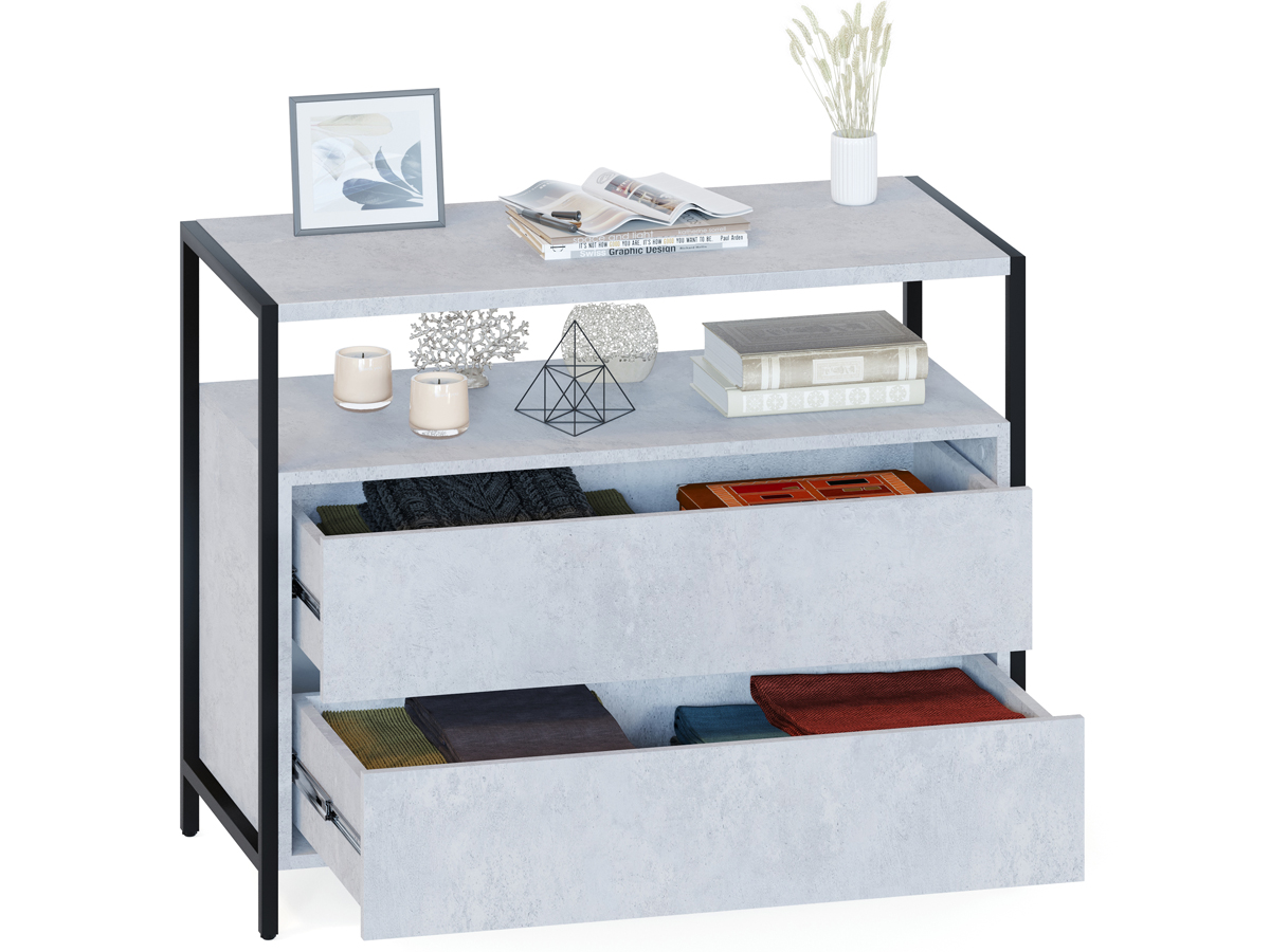 Функциональный комод Т-400 — оптимальное решение для тех, кому нужно организовать хранение вещей в гостиной, спальне или прихожей, используя пространство максимально эффективно. Рабочая поверхность шириной 940 мм и глубиной 449 мм позволит с комфортом разместить большой телевизор и предметы декора даже в самой маленькой комнате. За счет интересного решения с металлическим каркасом на регулируемых подпятниках и деталям толщиной 22 мм с противоударной кромкой создается современная обстановка в стиле лофт. Открытая ниша под столешницей обеспечит легкий доступ к предметам первой необходимости и сделает комод визуально легким, а два вместительных выдвижных ящика разместят все необходимые личные вещи, одежду и белье.