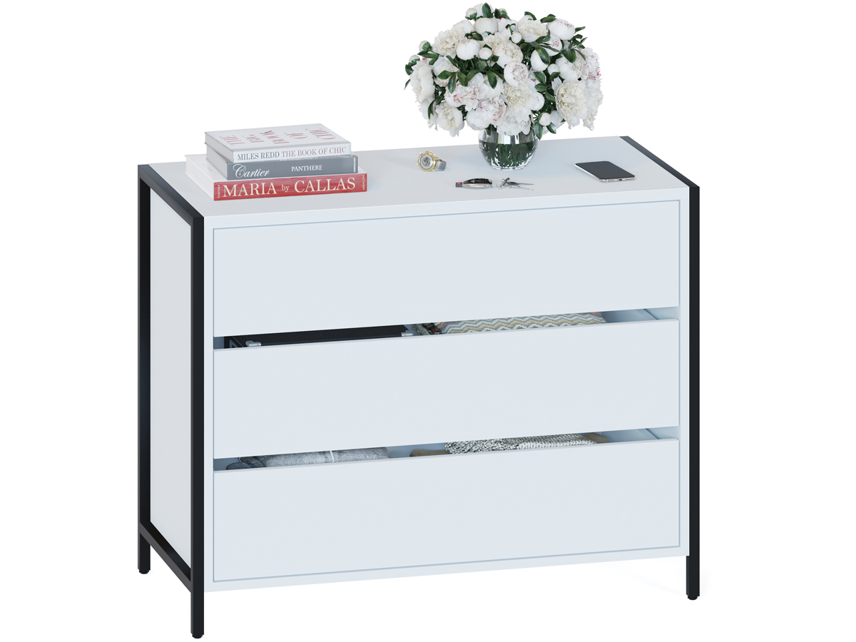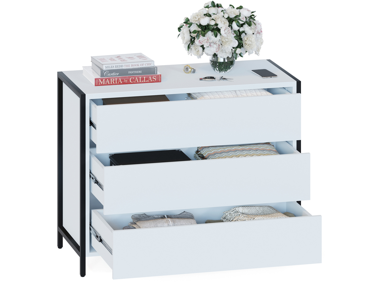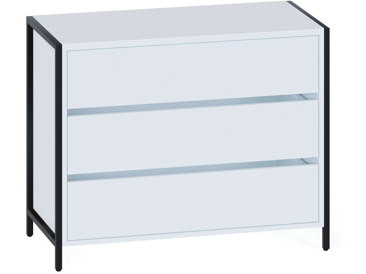 Комод Т-401 в стиле лофт — вместительная система хранения для современной спальни, гостиной или прихожей. Модель смотрится эффектно благодаря черному металлокаркасу на регулируемых подпятниках и деталям толщиной 22 мм с противоударной кромкой. Рабочая поверхность шириной 940 мм и глубиной 449 мм позволит с комфортом разместить большой телевизор и предметы декора, при этом эффективно задействуя пространство комнаты. Для хранения документов, белья и личных вещей предусмотрены три вместительных выдвижных ящика. Их плавное и бесшумное открывание обеспечивают надежные шариковые направляющие, а вместо привычных ручек сделаны стильные вырезы между фасадами.