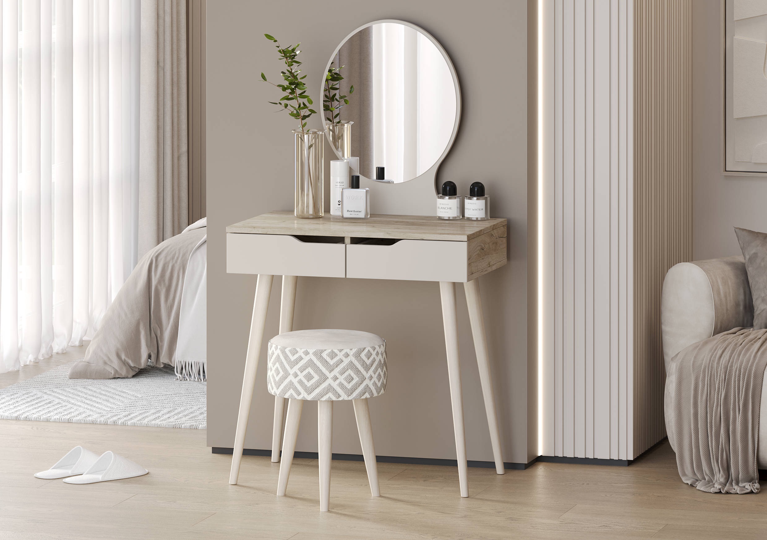 Круглое зеркало с изящными вогнутыми вырезами в нижней части панели придаёт модели утончённый облик. Два выдвижных ящика размером 229х350 мм на шариковых направляющих обеспечивают плавное и надёжное открывание. Открываются за фасад благодаря аккуратным вырезам сверху каждого ящика. Трюмо установлено на четыре высокие опоры-ножки высотой 590 мм, что создаёт ощущение лёгкости и делает уборку под ним удобной.