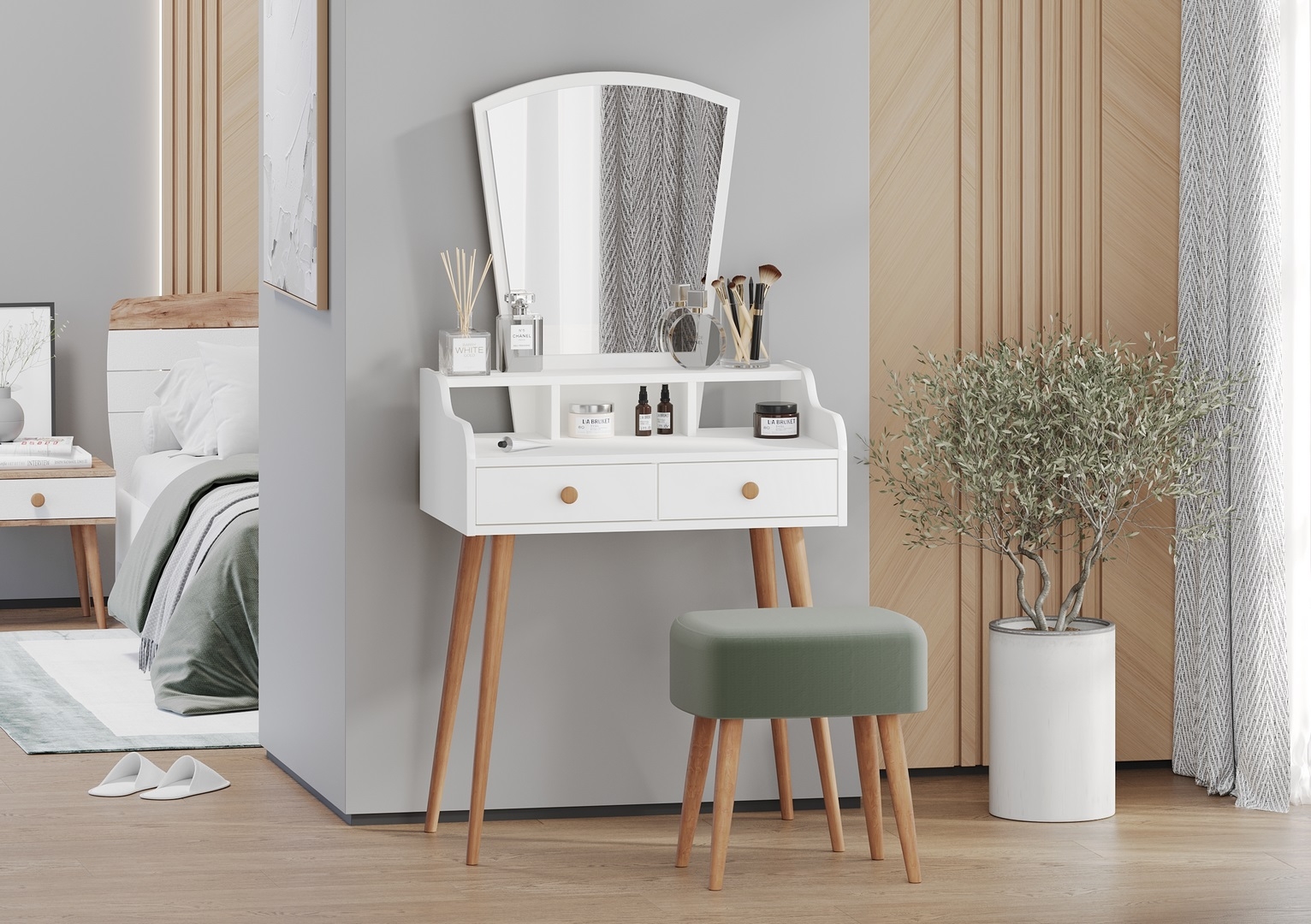 Арочное зеркало с расширенным закруглённым верхом установлено над надстройкой высотой 100 мм, выполненной по всей ширине столика. Под надстройкой предусмотрены три удобные ниши для хранения благодаря двум перегородкам. Два выдвижных ящика размером 300х400 мм на шариковых направляющих обеспечивают удобное хранение косметики, украшений и других аксессуаров. Ящики открываются при помощи аккуратных ручек в цвете бук. Трюмо установлена на четыре высокие ножки-опоры в цвете бук высотой 590 мм — это подчёркивает лёгкость дизайна и упрощает уборку под трюмо.