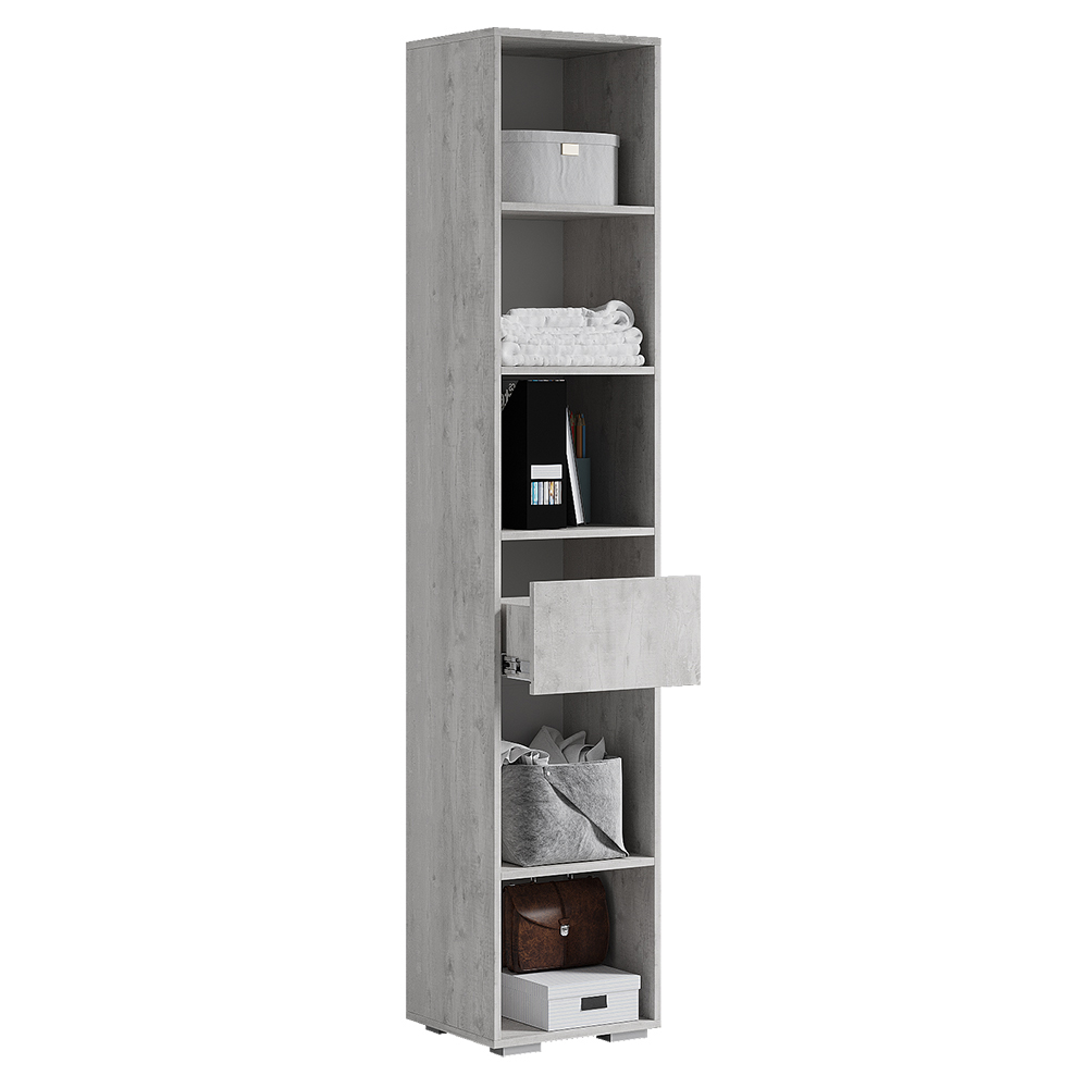 Современная компактная гостиная Мрия выполнена в трендовом цвете Бетон пайн светлый. Серия состоит из самого необходимого: тумба под ТВ, вместительные пеналы и открытая навесная полка, и позволит не загромождать комнату мебелью, а эффективно использовать пространство.