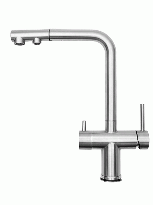 Смеситель для кухни из нержавеющей стали с возможностью подключения фильтрованной воды и вытяжным изливом.