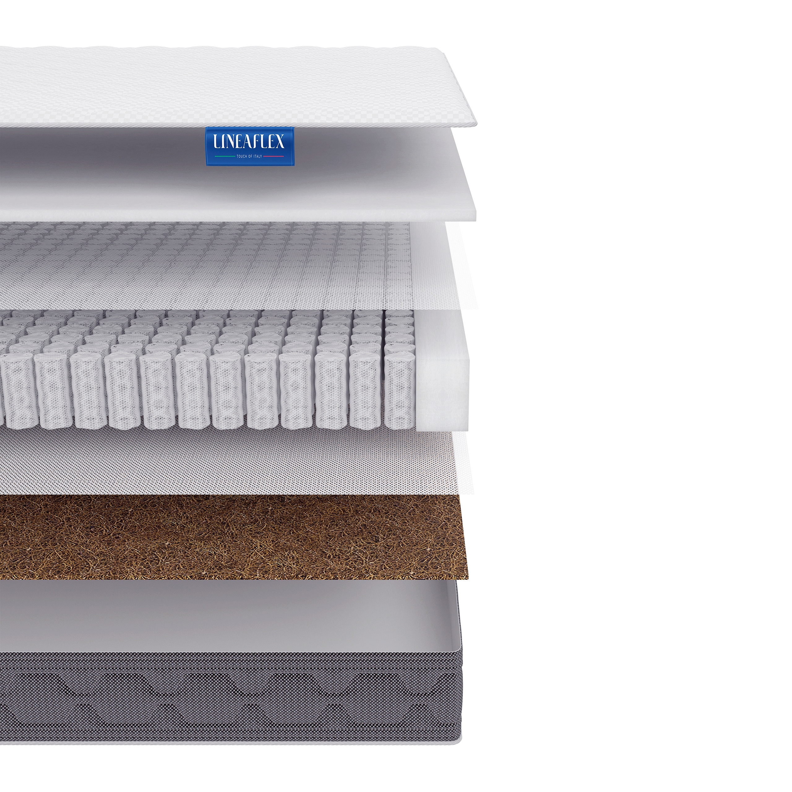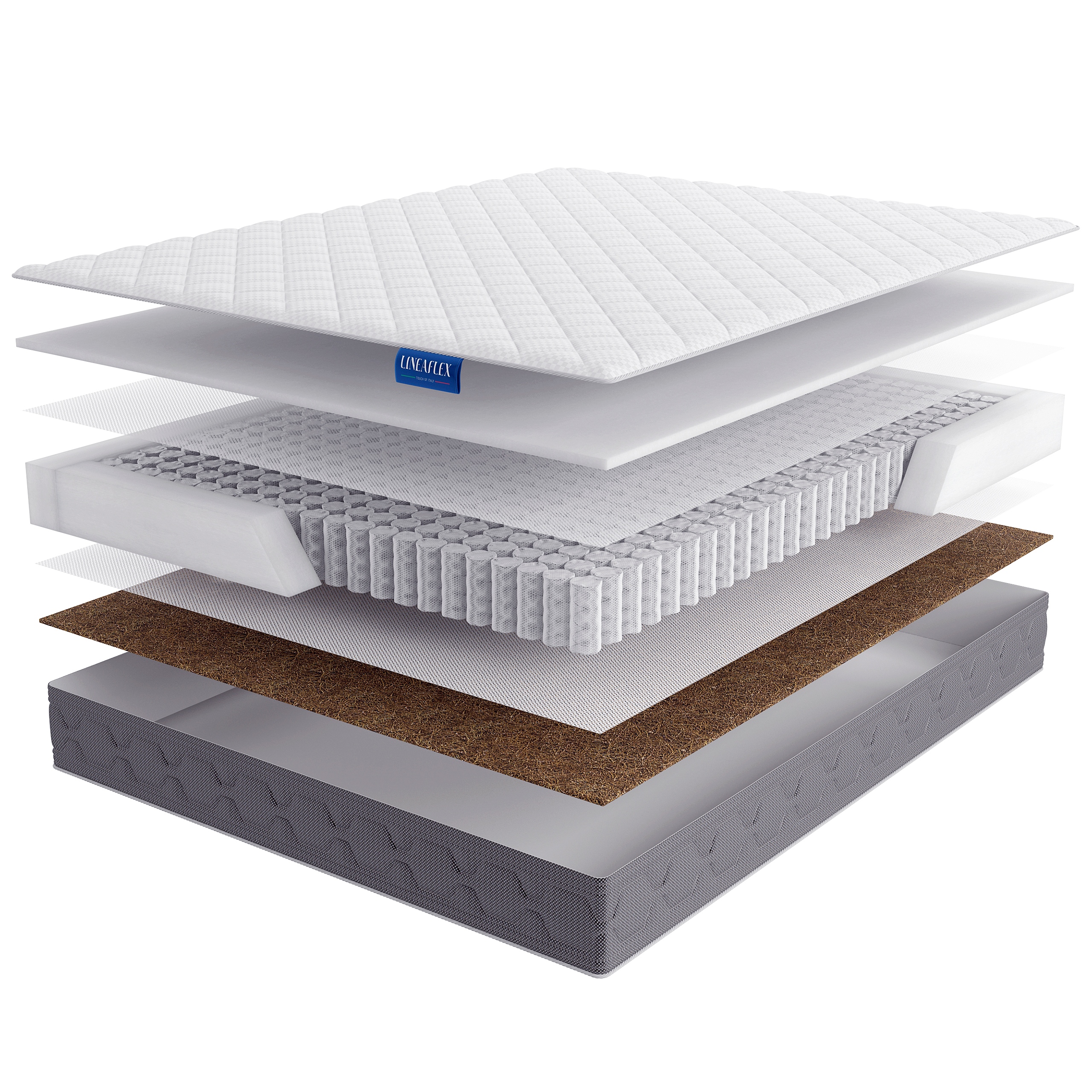 Его независимый пружинный блок обеспечивает равномерное распределение нагрузки, что способствует поддержанию правильного положения тела во время отдыха. Основной наполнитель Coirflex, выполненный из латексированной кокосовой койры, и Ergoflex, пена на водной основе, создают оптимальный баланс жесткости и мягкости.