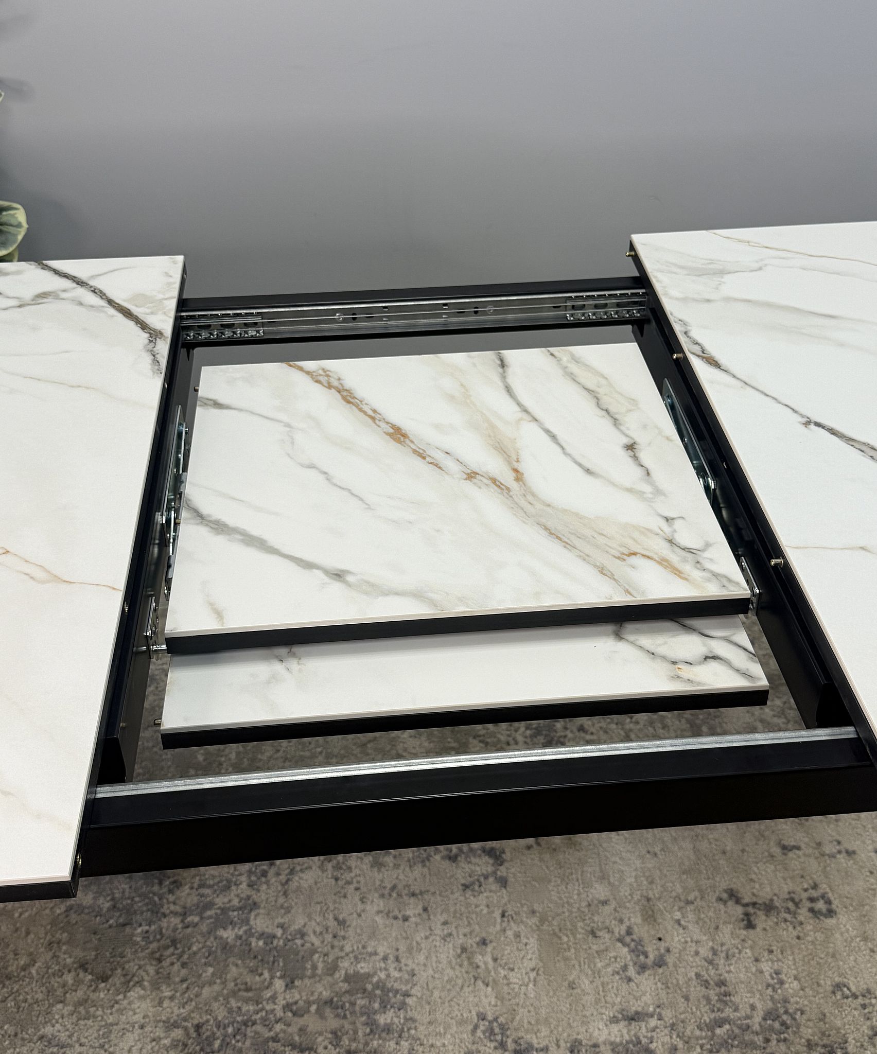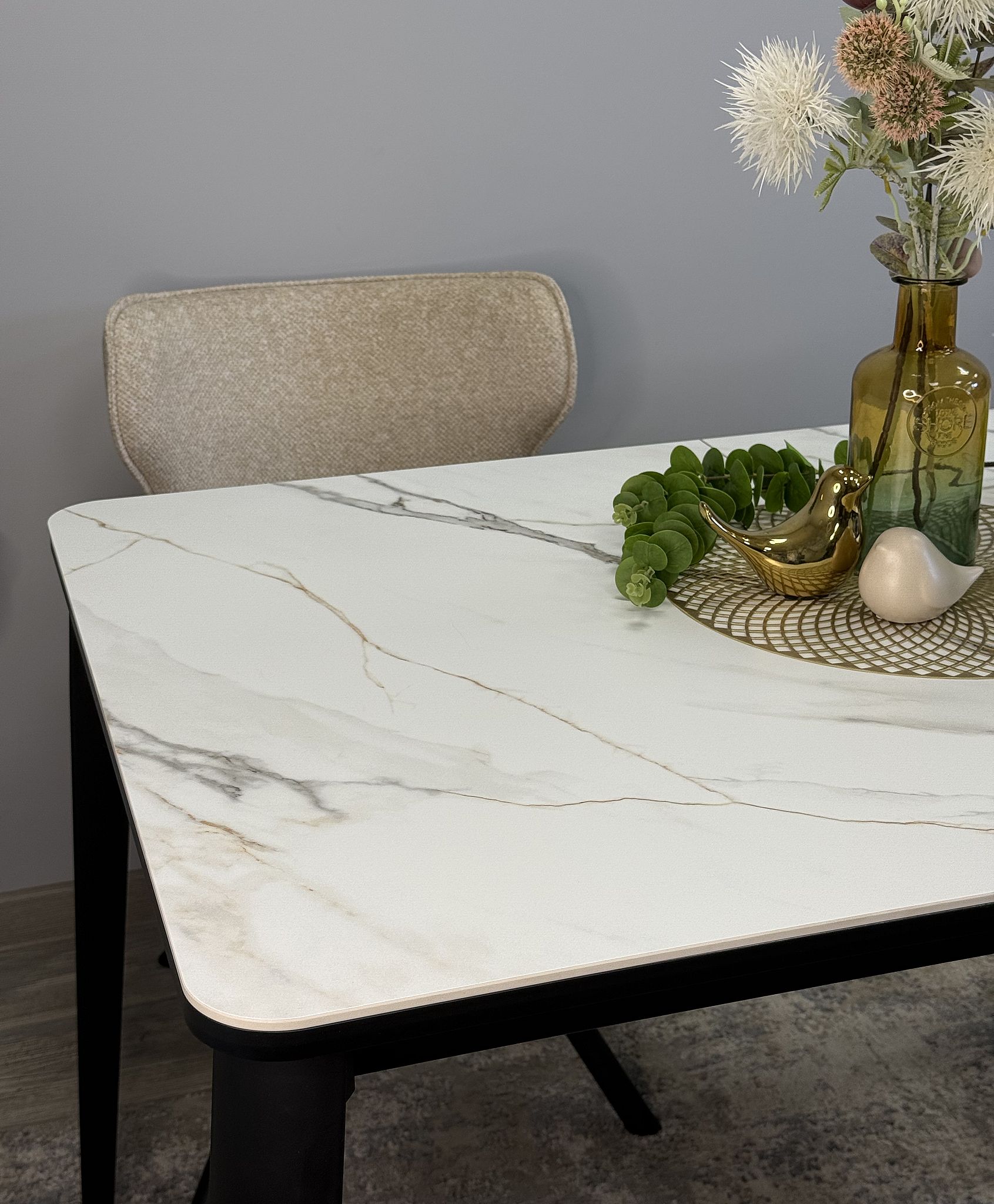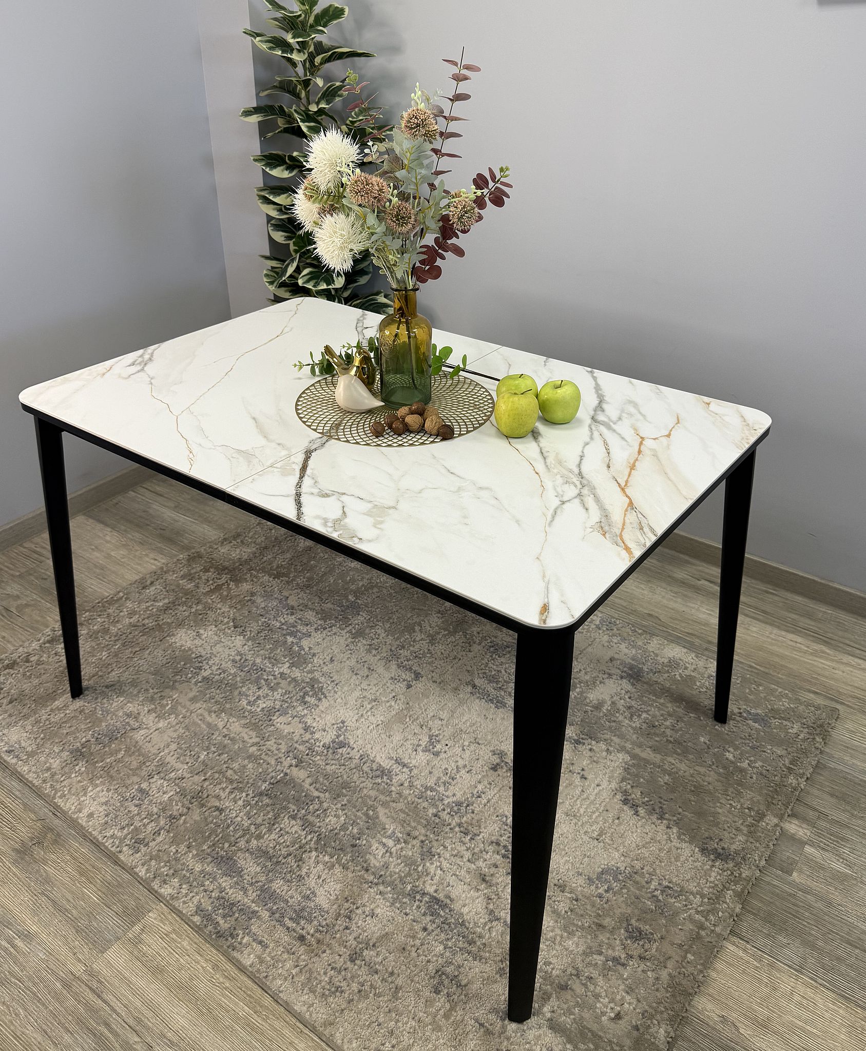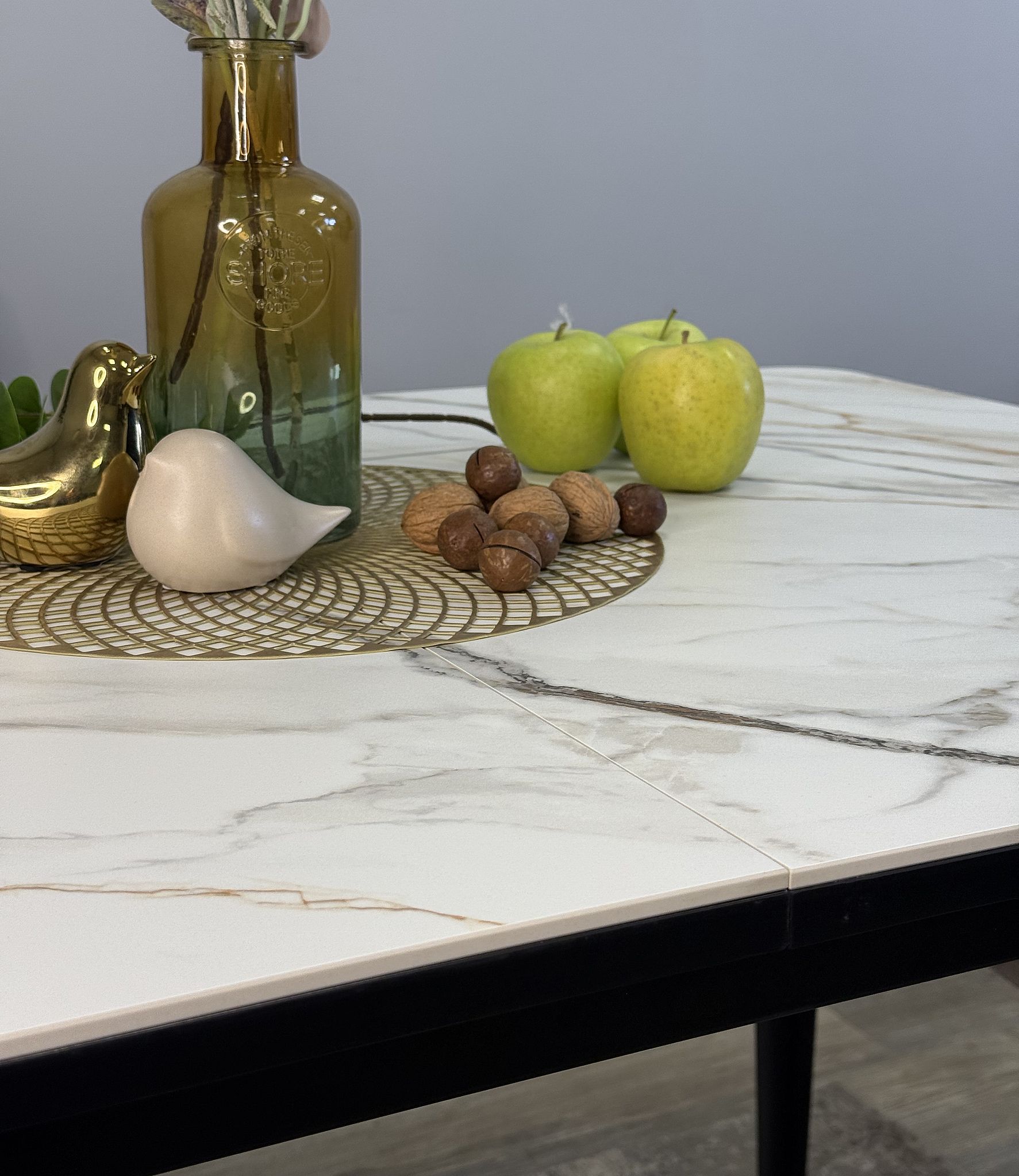 Стол с керамической столешницей и красивыми, функциональными опорами. Керамических столов такого размера очень мало, а размер 120*80 см оптимален для кухни до 13 кв. м. Система раскладки увеличивает стол еще на 45 см благодаря синхронному механизму раздвижения и прогрессивного механизму вставки "дельфин". Вставка с керамикой очень тяжелая и требует специального механизма, предназначенного для керамики. Стол сможет разложить даже ребенок