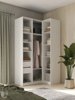 Угловая форма шкафа позволяет использовать даже самые труднодоступные места, что делает его универсальным решением для малогабаритных квартир и домов. Этот шкаф идеально подойдет для спальни, детской или прихожей, легко сочетаясь с другими предметами мебели.