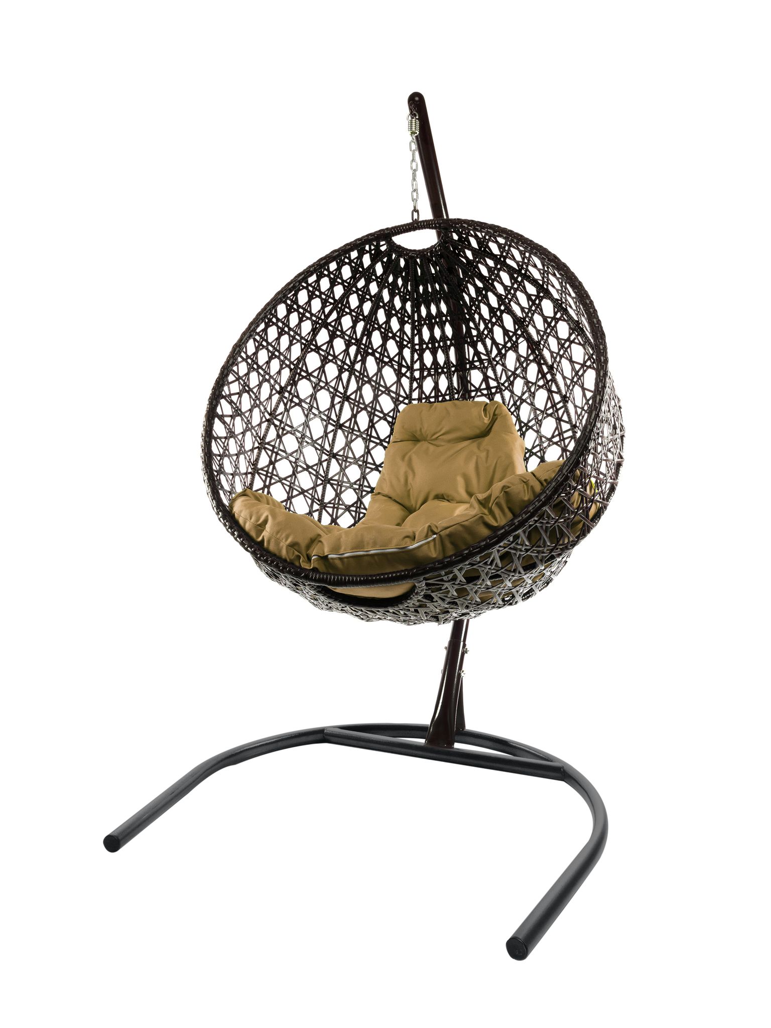 Качели подвесные устойчивы к перепадам температур, осадкам и солнечным лучам. Усиленная стойка для садовых качелей выполнена из металла с порошковым покрытием. Стальной каркас-кокон исполнен по особой технологии с декоративным, плетением из искусственного экоротанга собственного производства (прочным материалом, без запаха, не восприимчивым к неблагоприятным температурным и погодным условиям). Корпус качели с ротангом выдерживает нагрузку до 140 кг.