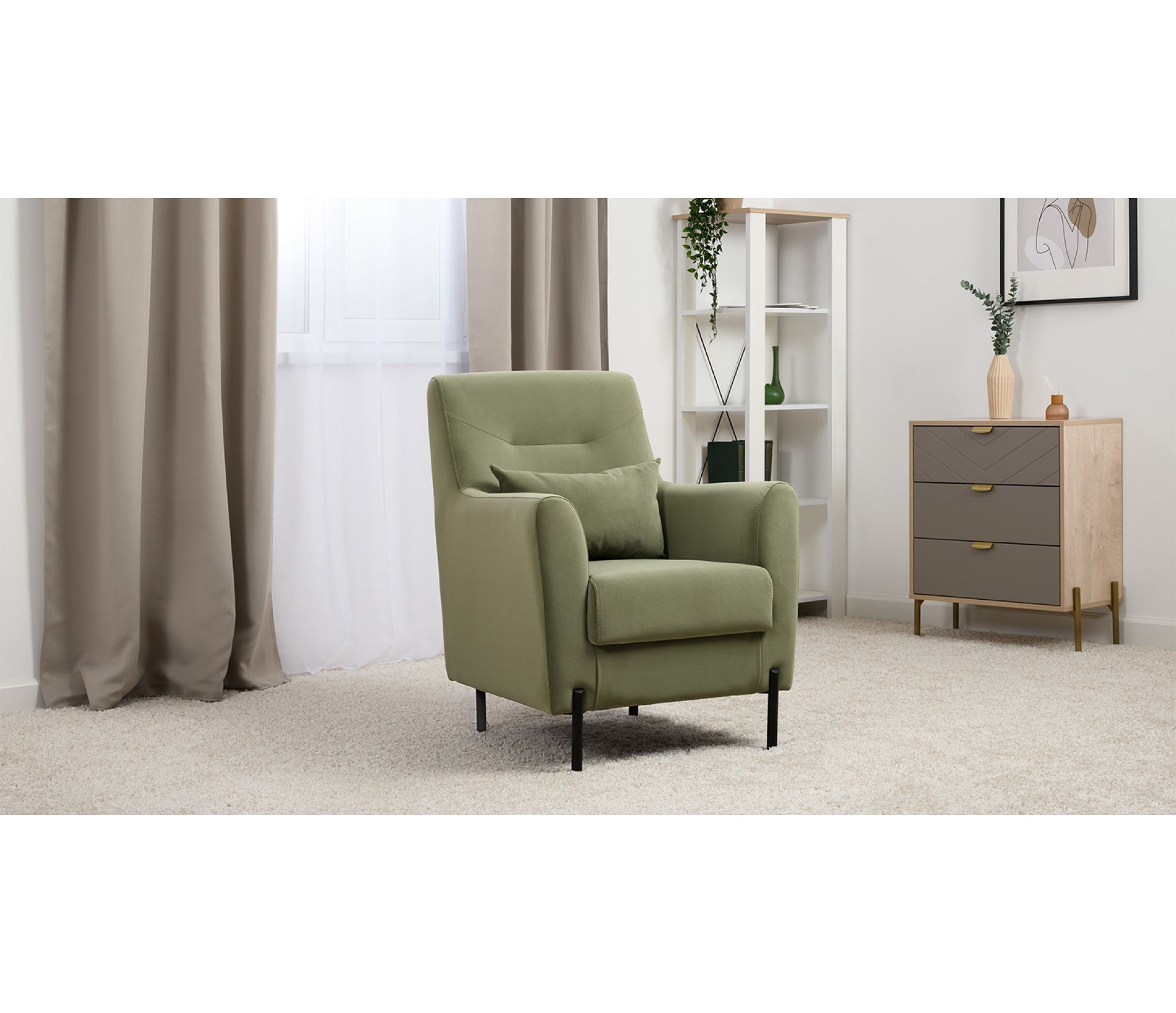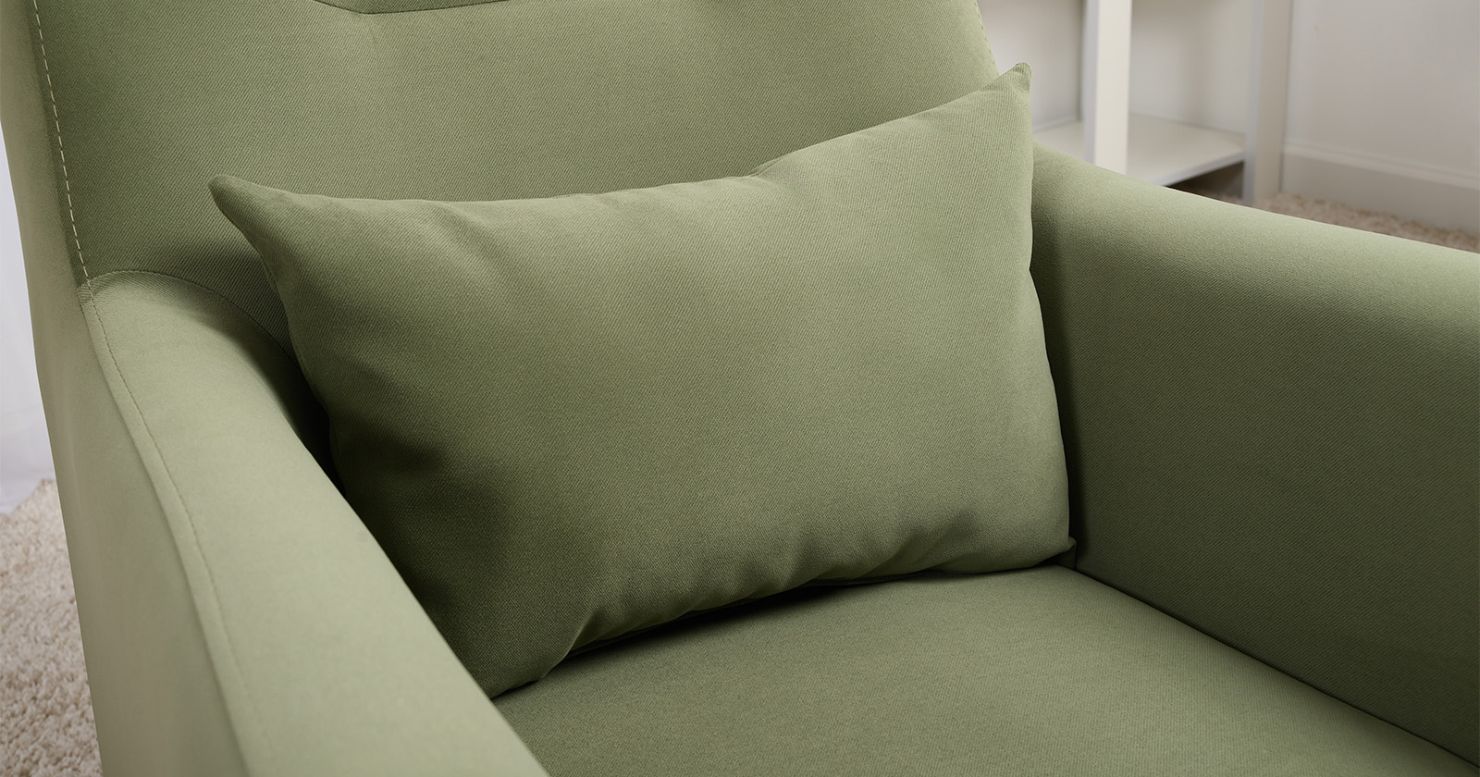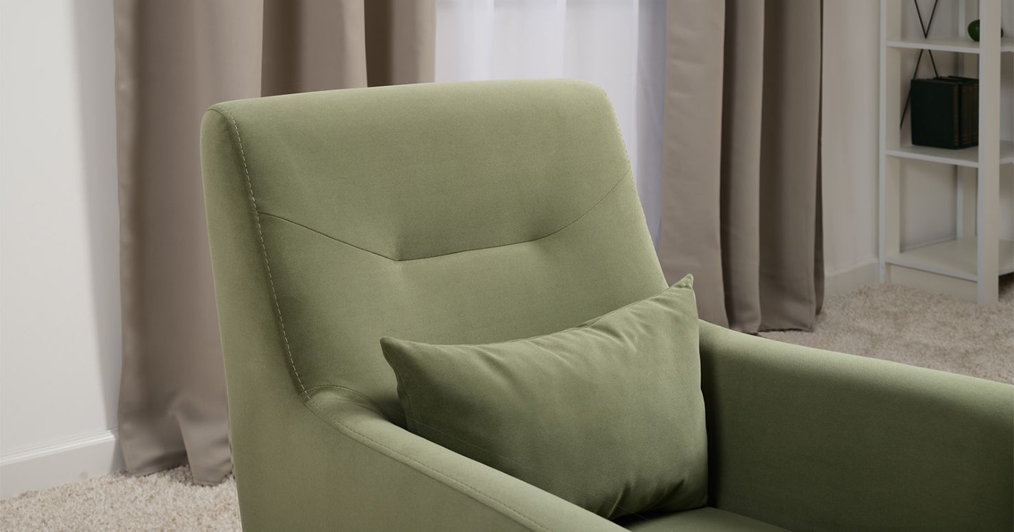 Декоративная утяжка на спинке кресла, декоративная подушка в цвете кресла, металлические опоры переходят в декоративный элемент подлокотника