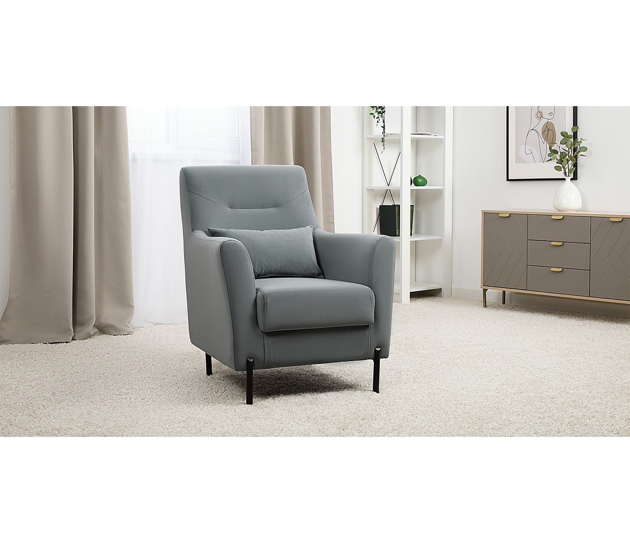 Декоративная утяжка на спинке кресла, декоративная подушка в цвете кресла, металлические опоры переходят в декоративный элемент подлокотника