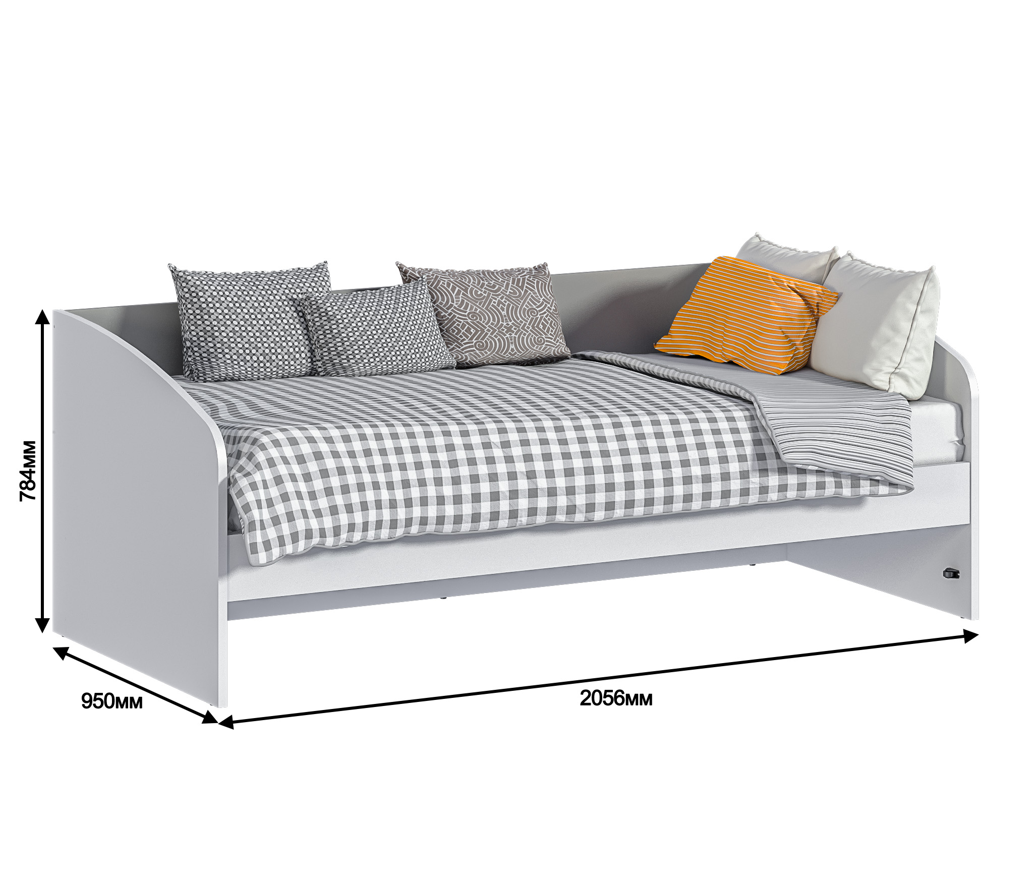 - Кровать с основанием. Размер спального места: 900 х 2000 мм. Габаритные размеры кровати: Ш 2060 х В 780 х Г 950 мм.