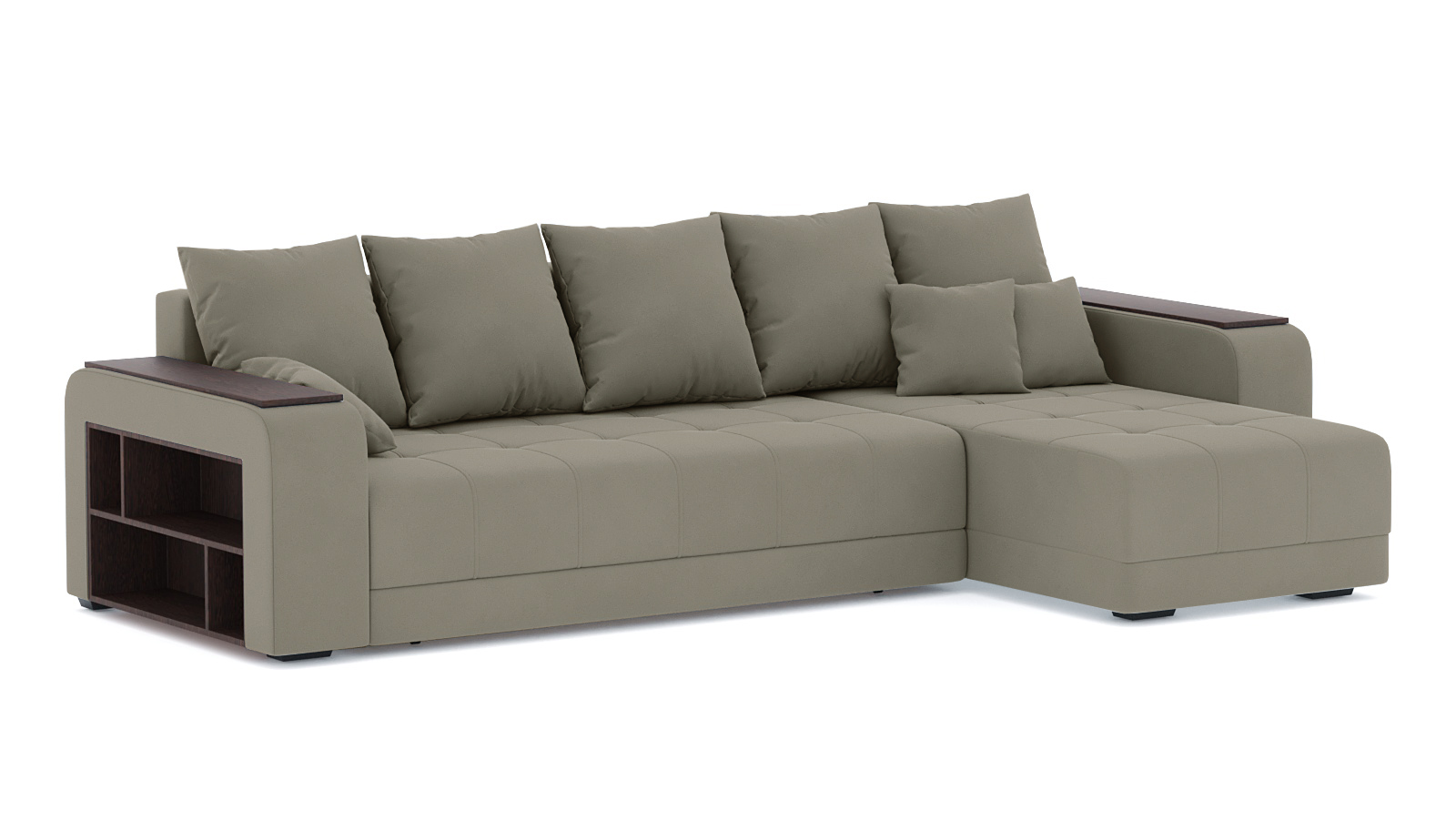 Механизм трансформации еврокнижка. Наполнение пружинный блок+высокоэластичный ППУ. Спальное место 2400х1600. Ящик для белья есть. Глубина сиденья без подушек 900мм. Высота сиденья 430мм. Чехлы подушек несъёмные, наполнение крошка ППУ. В комплекте 5 больших подушкек и 3 декоративные. Угол дивана универсальный, подлокотники взаимозаменяемые.