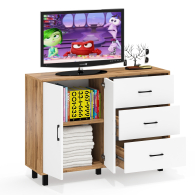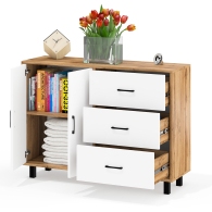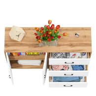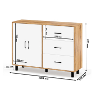 Комод-тумба может использоваться не только для хранения, но и как стильная ТВ-тумба, которая подчеркнет современный дизайн вашего интерьера. Комод оснащен просторным и продуманным функционалом. Слева находится пара распашных дверок (732х284 мм), за которыми предусмотрена полка для аккуратного размещения вещей. Справа три одинаковых выдвижных ящика. Размер фасадов ящиков составляет 242х570 мм, что обеспечивает достаточную вместимость. Ящики оборудованы шариковыми направляющими длиной 350 мм, что обеспечивает плавное и тихое выдвижение.