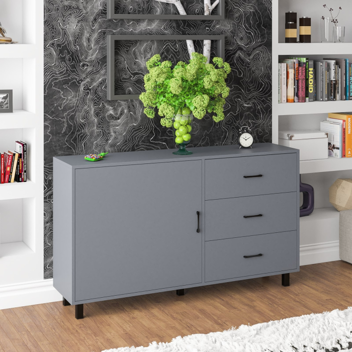 Для удобства открывания двери и ящиков используются стильные металлические ручки длиной 128 мм черного цвета, которые гармонично дополняют общий дизайн. Корпус и фасады выполнены из высококачественной ламинированной ДСП толщиной 16 мм, а торцы надежно обработаны ПВХ-кромкой. Задняя стенка и дно ящиков изготовлены из ламинированной ДВП, что добавляет долговечности конструкции. Обратите внимание, что комод не имеет универсальной сборки - дверка расположена только слева, а ящики – справа. Поставляется в разобранном виде.