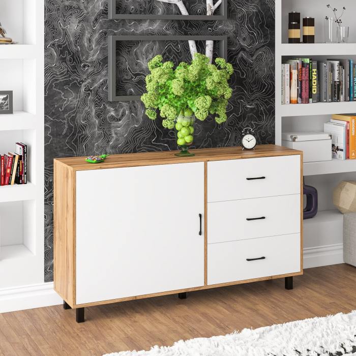Для удобства открывания двери и ящиков используются стильные металлические ручки длиной 128 мм черного цвета, которые гармонично дополняют общий дизайн. Корпус и фасады выполнены из высококачественной ламинированной ДСП толщиной 16 мм, а торцы надежно обработаны ПВХ-кромкой. Задняя стенка и дно ящиков изготовлены из ламинированной ДВП, что добавляет долговечности конструкции. Обратите внимание, что комод не имеет универсальной сборки - дверка расположена только слева, а ящики – справа. Поставляется в разобранном виде.