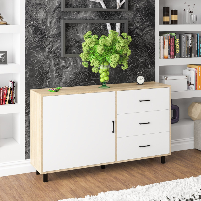 Для удобства открывания двери и ящиков используются стильные металлические ручки длиной 128 мм черного цвета, которые гармонично дополняют общий дизайн. Корпус и фасады выполнены из высококачественной ламинированной ДСП толщиной 16 мм, а торцы надежно обработаны ПВХ-кромкой. Задняя стенка и дно ящиков изготовлены из ламинированной ДВП, что добавляет долговечности конструкции. Обратите внимание, что комод не имеет универсальной сборки - дверка расположена только слева, а ящики – справа. Поставляется в разобранном виде.