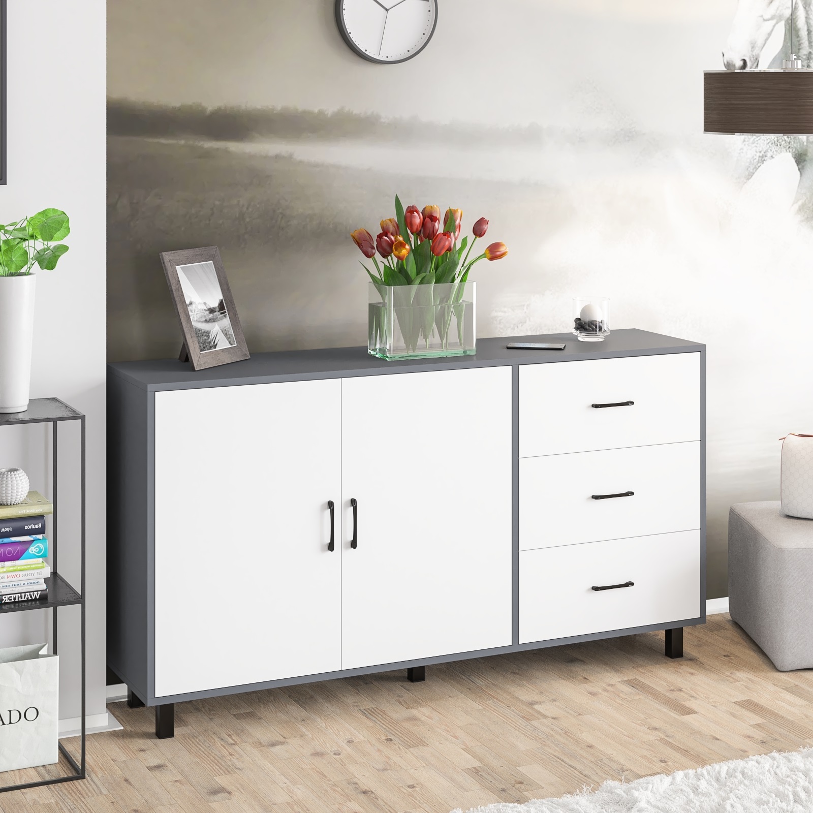 Тумба-комод может использоваться не только для хранения, но и как стильная ТВ-тумба, которая подчеркнет современный дизайн вашего интерьера. Комод оснащен просторным и продуманным функционалом. Слева находится пара распашных дверок (732х484 мм), за которыми предусмотрена полка для аккуратного размещения вещей. Справа три одинаковых выдвижных ящика. Размер фасадов ящиков составляет (242х570 мм), что обеспечивает достаточную вместимость. Ящики оборудованы шариковыми направляющими длиной 350 мм, что обеспечивает плавное и тихое выдвижение.