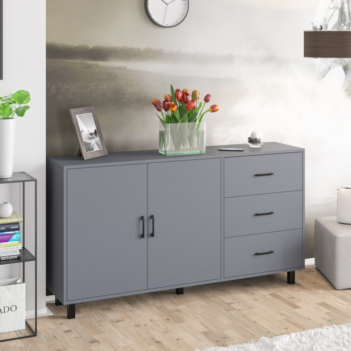 Тумба-комод может использоваться не только для хранения, но и как стильная ТВ-тумба, которая подчеркнет современный дизайн вашего интерьера. Комод оснащен просторным и продуманным функционалом. Слева находится пара распашных дверок (732х484 мм), за которыми предусмотрена полка для аккуратного размещения вещей. Справа три одинаковых выдвижных ящика. Размер фасадов ящиков составляет (242х570 мм), что обеспечивает достаточную вместимость. Ящики оборудованы шариковыми направляющими длиной 350 мм, что обеспечивает плавное и тихое выдвижение.