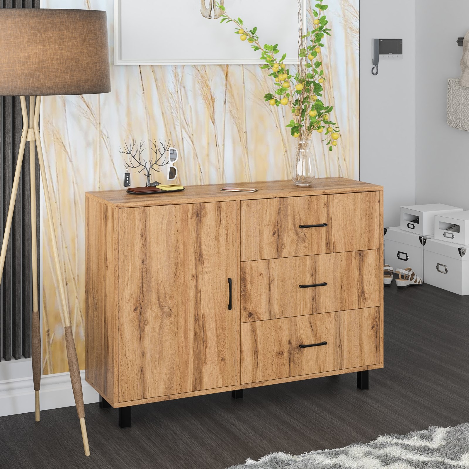 Комод-тумба может использоваться не только для хранения, но и как стильная ТВ-тумба, которая подчеркнет современный дизайн вашего интерьера. Комод оснащен просторным и продуманным функционалом. Слева находится распашная дверка (732х486 мм), за которой предусмотрена полка для аккуратного размещения вещей. Справа три одинаковых выдвижных ящика. Размер фасадов ящиков составляет (242х654 мм), что обеспечивает достаточную вместимость. Комод установлен на пять металлических опор черного цвета высотой 100 мм, придающие конструкции устойчивость и современный внешний вид.