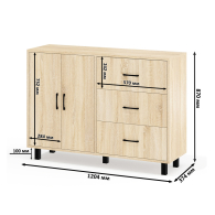 Обратите внимание, что комоды не имеют универсальной сборки - дверцы расположены только слева, а ящики – справа. Каждый комод установлен на пять металлических опор черного цвета высотой 100 мм, придающие конструкции устойчивость и современный внешний вид. Для удобства открывания дверей и ящиков используются стильные металлические ручки длиной 128 мм черного цвета, которые гармонично дополняют общий дизайн. Корпус и фасады выполнены из высококачественной ламинированной ДСП толщиной 16 мм, а торцы надежно обработаны ПВХ-кромкой. Задняя стенка и дно ящиков изготовлены из ламинированной ДВП, что добавляет долговечности конструкции. Поставляется в разобранном виде.