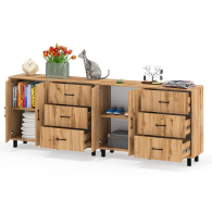 Обратите внимание, что комоды не имеют универсальной сборки - дверцы расположены только слева, а ящики – справа. Каждый комод установлен на пять металлических опор черного цвета высотой 100 мм, придающие конструкции устойчивость и современный внешний вид. Для удобства открывания дверей и ящиков используются стильные металлические ручки длиной 128 мм черного цвета, которые гармонично дополняют общий дизайн. Корпус и фасады выполнены из высококачественной ламинированной ДСП толщиной 16 мм, а торцы надежно обработаны ПВХ-кромкой. Задняя стенка и дно ящиков изготовлены из ламинированной ДВП, что добавляет долговечности конструкции. Поставляется в разобранном виде.