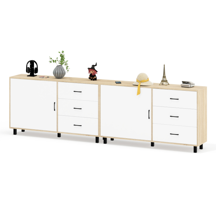 Тумба-комод может использоваться не только для хранения, но и как стильная ТВ-тумба, которая подчеркнет современный дизайн вашего интерьера. В комплекте две тумбы-комода, объединенных в единый блок. Каждый комод оснащен просторным и продуманным функционалом. Слева у каждой тумбы-комода находится распашная дверка (732х786 мм), за которой предусмотрена полка для аккуратного размещения вещей. Справа у каждой тумбы-комода расположены три одинаковых выдвижных ящика. Размер фасадов ящиков составляет 242х654 мм, что обеспечивает достаточную вместимость. Каждая тумба-комод установлена на пять металлических опор черного цвета высотой 100 мм, придающие конструкции устойчивость и современный внешний вид. Для удобства открывания двери и ящиков используются стильные металлические ручки длиной 128 мм черного цвета, которые гармонично дополняют общий дизайн.