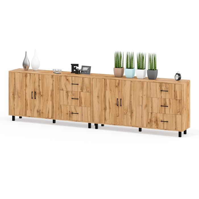 Обратите внимание, что тумбы-комоды не имеют универсальной сборки - дверцы расположены только слева, а ящики – справа. Каждая тумба-комод установлен на пять металлических опор черного цвета высотой 100 мм, придающие конструкции устойчивость и современный внешний вид. Для удобства открывания дверей и ящиков используются стильные металлические ручки длиной 128 мм черного цвета, которые гармонично дополняют общий дизайн. Корпус и фасады выполнены из высококачественной ламинированной ДСП толщиной 16 мм, а торцы надежно обработаны ПВХ-кромкой. Задняя стенка и дно ящиков изготовлены из ламинированной ДВП, что добавляет долговечности конструкции. Поставляется в разобранном виде.