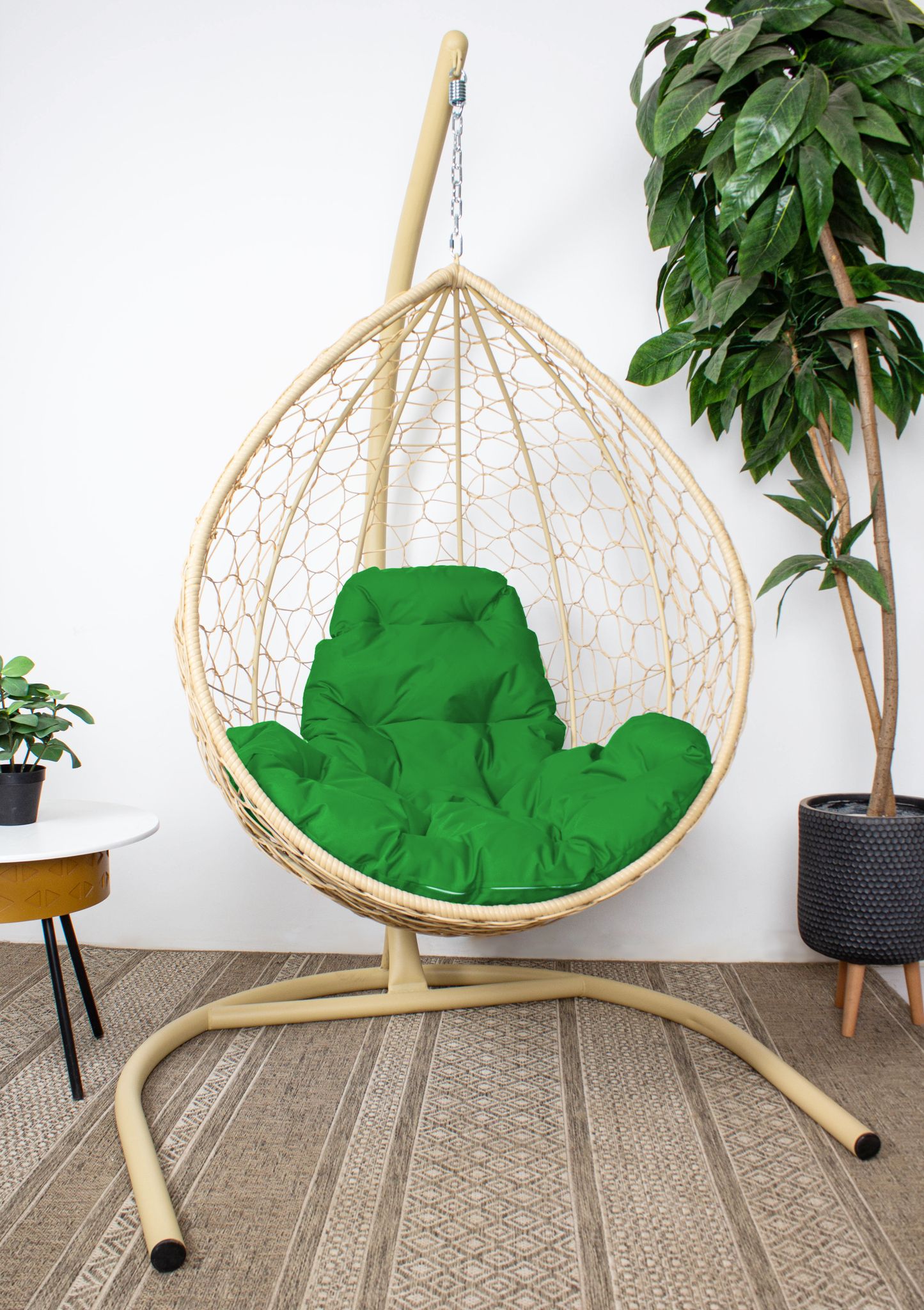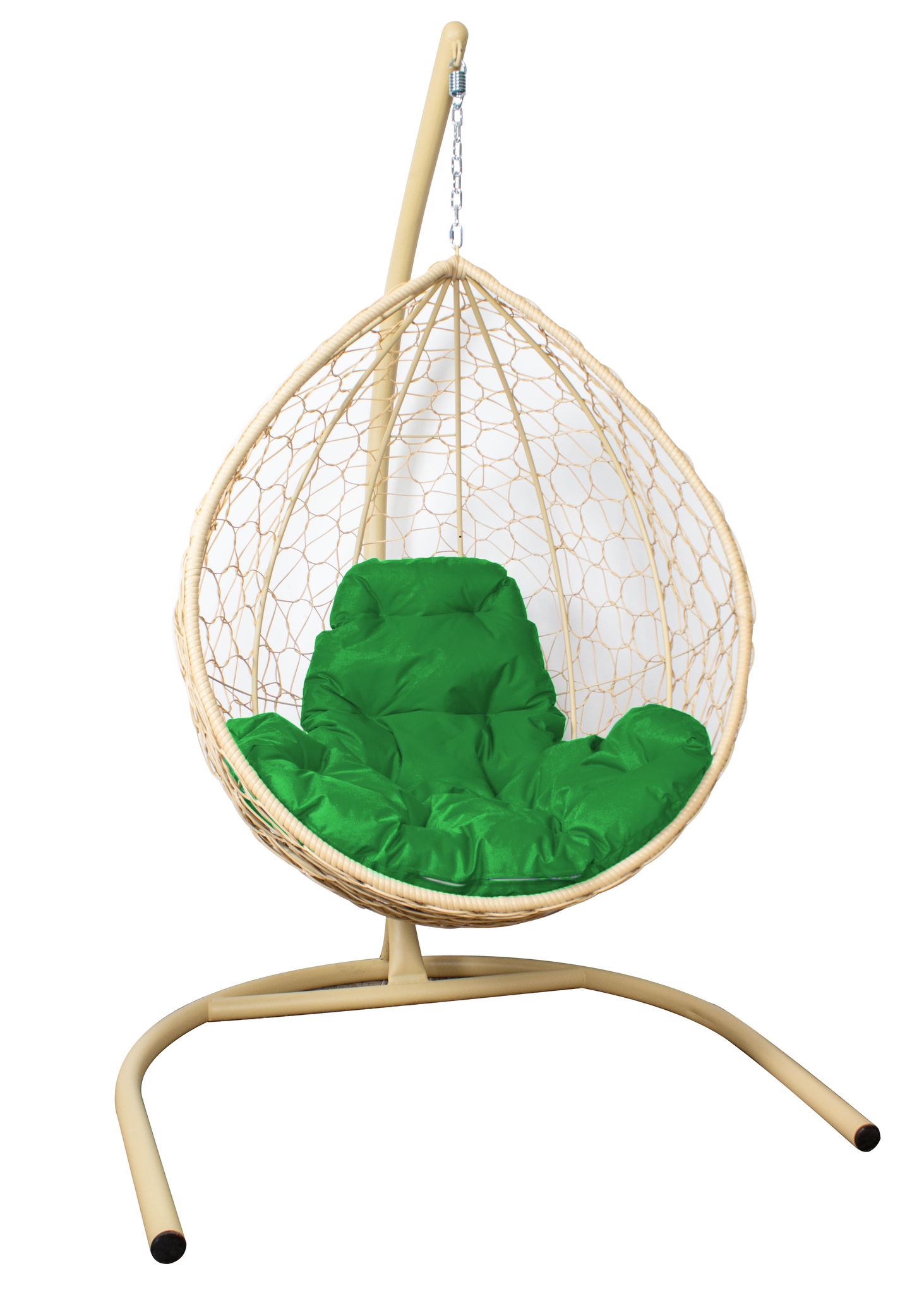 Стойка для садовых качелей выполнена из металла с порошковым покрытием. Стальной каркас-кокон исполнен по особой технологии с декоративным, плетением из искусственного экоротанга собственного производства (прочным материалом, без запаха, не восприимчивым к неблагоприятным температурным и погодным условиям). Корпус качели с ротангом выдерживает нагрузку до 120 кг.