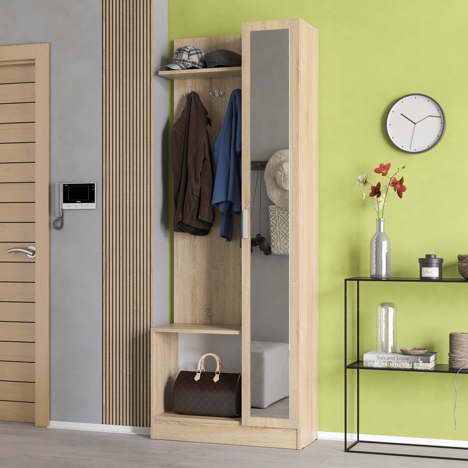 Слева сверху расположена панель с тремя двухрожковыми крючками под антресольной полкой для головных уборов, а снизу — открытая ниша для обуви. Справа — пенал с распашной дверкой, оснащённой зеркалом в полный рост размером 20х190 см. Внутри пенала — три полки, причём верхняя и нижняя съёмные для гибкой настройки хранения. Модель не имеет универсальной сборки — дверь с зеркалом устанавливается исключительно справа, а крючки с полкой — только слева. Прихожая помогает удобно разместить одежду, обувь и мелкие аксессуары, а зеркало позволяет оценить образ перед выходом. Пластиковые подпятники защищают пол от повреждений и делают установку безопасной для напольного покрытия.