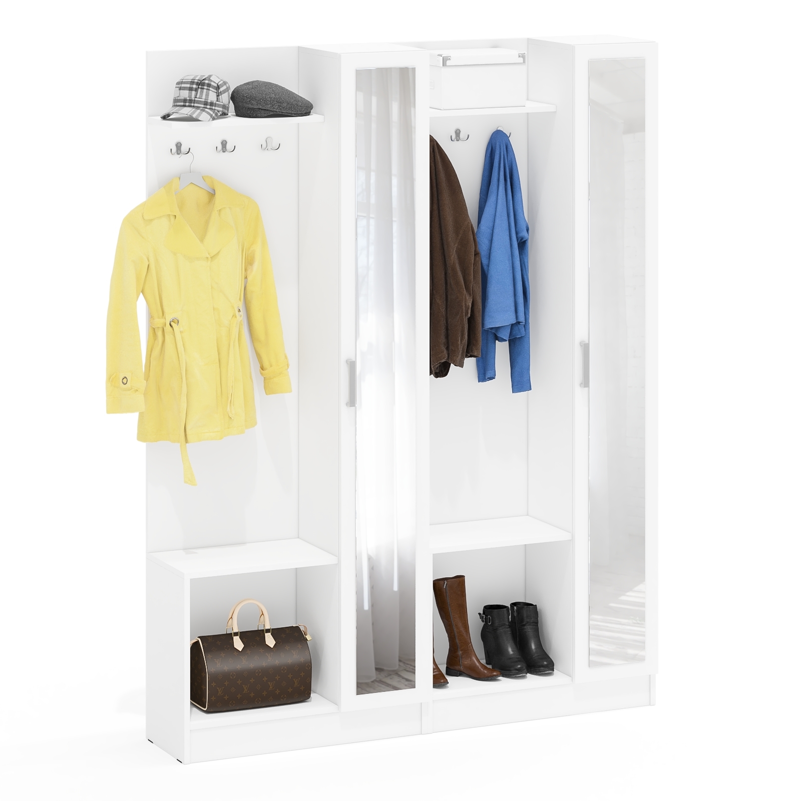 Такой набор позволяет организовать хранение одежды и обуви в едином стиле, обеспечивая порядок и комфорт. Каждая из прихожих легко размещается у стены, идеально подходя для узких коридоров и небольших ниш. Установка двух модулей даёт больше вариантов компоновки — можно установить симметрично по сторонам двери или в разных зонах прихожей.