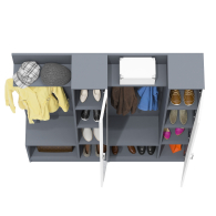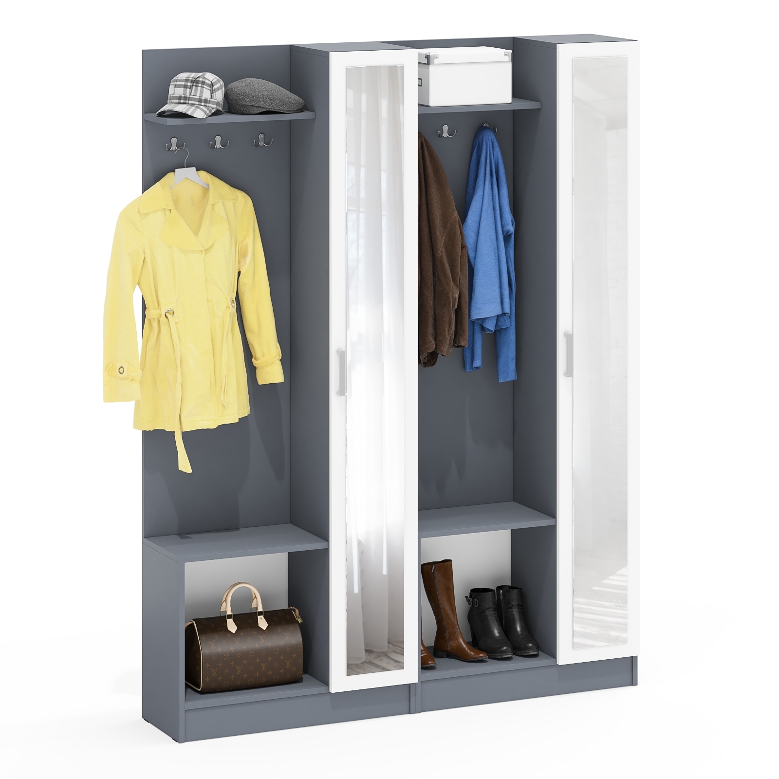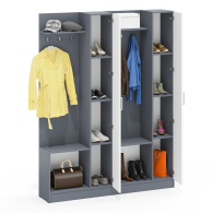 В каждом модуле слева сверху расположена панель с тремя двухрожковыми крючками под антресольной полкой, а внизу — открытая ниша для обуви. Справа — высокий пенал с распашной дверкой, оснащённой зеркалом в полный рост размером 20х190 см. Внутри пенала три полки, верхняя и нижняя из них съёмные. Сборка не универсальная — дверь с зеркалом всегда справа, а панель с крючками — слева. Такой комплект обеспечивает вдвое больше мест для хранения и два зеркала, что особенно удобно для семейного использования. Пластиковые подпятники защищают пол от повреждений и делают установку безопасной для напольного покрытия.