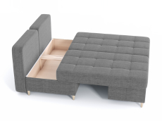 Механизм трансформации еврокнижка-трансформер. Каркас ДСП, ДВП, ЛДСП, фанера, брус хвойных пород. Спальное место 2050х1550мм. Наполнение высокоэластичный ППУ. Ящик для белья есть. Наполнение подушек-крошка ППУ. Высота сиденья от пола 440мм. Глубина сиденья без подушек 750мм. Опоры из массива берызы. Высота опоры 100мм. В комплекте 2 большие подушеки.