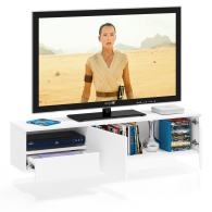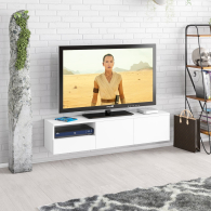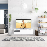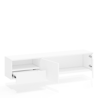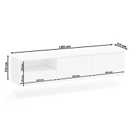 Тумба удобно размещается на стене под телевизором, освобождая пространство на полу и придавая интерьеру лёгкость. Слева находится открытая ниша для техники и аксессуаров, под ней — выдвижной ящик на шариковых направляющих для хранения мелочей. Справа расположено отделение за двумя распашными дверками, идеально подходящее для скрытого хранения. Благодаря подвесной конструкции тумба создаёт ощущение простора и облегчает уборку под ней. Сборка не универсальная — открытая ниша и выдвижной ящик всегда располагаются только слева. Фасады не имеют ручек — открывание ящика и дверок осуществляется за край. Крепление к стене осуществляется с помощью трёх угловых навесов, обеспечивающих надёжную фиксацию.