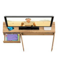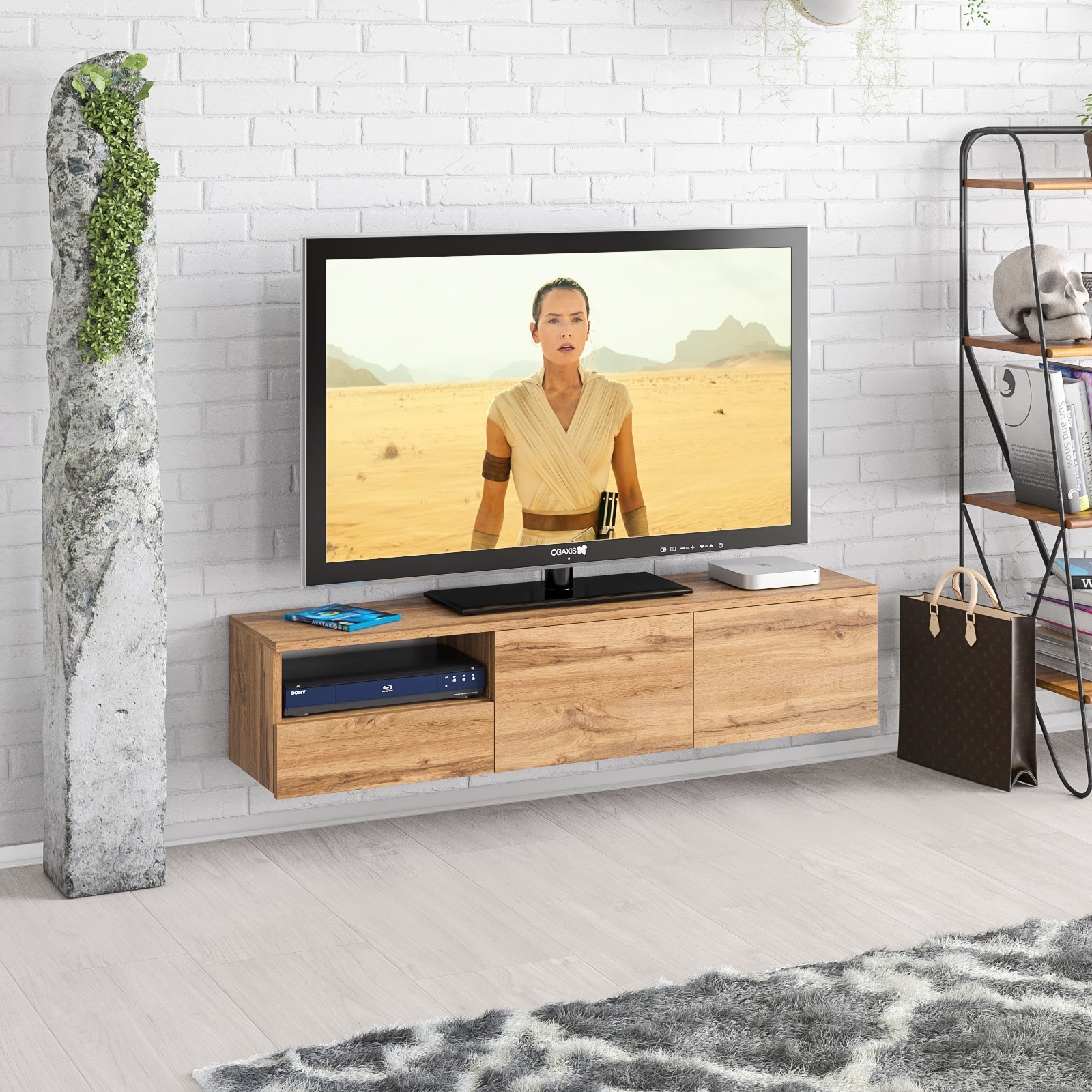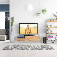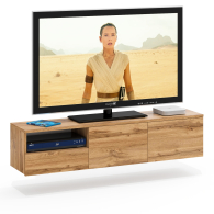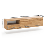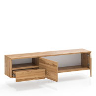 Тумба удобно размещается на стене под телевизором, освобождая пространство на полу и придавая интерьеру лёгкость. Слева находится открытая ниша для техники и аксессуаров, под ней — выдвижной ящик на шариковых направляющих для хранения мелочей. Справа расположено отделение за двумя распашными дверками, идеально подходящее для скрытого хранения. Благодаря подвесной конструкции тумба создаёт ощущение простора и облегчает уборку под ней. Сборка не универсальная — открытая ниша и выдвижной ящик всегда располагаются только слева. Фасады не имеют ручек — открывание ящика и дверок осуществляется за край. Крепление к стене осуществляется с помощью трёх угловых навесов, обеспечивающих надёжную фиксацию.