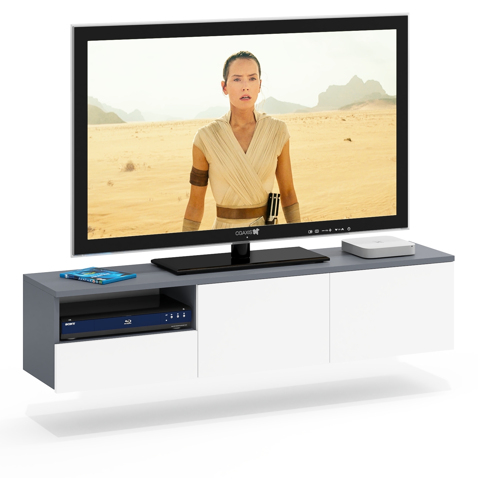 Тумба удобно размещается на стене под телевизором, освобождая пространство на полу и придавая интерьеру лёгкость. Слева находится открытая ниша для техники и аксессуаров, под ней — выдвижной ящик на шариковых направляющих для хранения мелочей. Справа расположено отделение за двумя распашными дверками, идеально подходящее для скрытого хранения. Благодаря подвесной конструкции тумба создаёт ощущение простора и облегчает уборку под ней. Сборка не универсальная — открытая ниша и выдвижной ящик всегда располагаются только слева. Фасады не имеют ручек — открывание ящика и дверок осуществляется за край. Крепление к стене осуществляется с помощью трёх угловых навесов, обеспечивающих надёжную фиксацию.