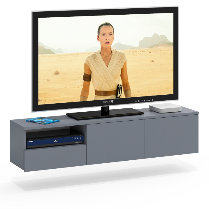 Тумба удобно размещается на стене под телевизором, освобождая пространство на полу и придавая интерьеру лёгкость. Слева находится открытая ниша для техники и аксессуаров, под ней — выдвижной ящик на шариковых направляющих для хранения мелочей. Справа расположено отделение за двумя распашными дверками, идеально подходящее для скрытого хранения. Благодаря подвесной конструкции тумба создаёт ощущение простора и облегчает уборку под ней. Сборка не универсальная — открытая ниша и выдвижной ящик всегда располагаются только слева. Фасады не имеют ручек — открывание ящика и дверок осуществляется за край. Крепление к стене осуществляется с помощью трёх угловых навесов, обеспечивающих надёжную фиксацию.