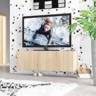 Благодаря подвесной конструкции, тумба не занимает место на полу и визуально облегчает пространство. Модель оборудована двумя вместительными отделениями без полок, каждое закрывается откидной дверкой на газлифтах — они обеспечивают плавное и тихое открывание. Такой формат хранения удобно использовать для техники, медиаплееров и прочих аксессуаров. Подвесной формат мебели не только визуально расширяет пространство, но и облегчает уборку под тумбой. Ручки отсутствуют — дверки открываются за край фасадов, сохраняя лаконичный внешний вид. Тумба крепится на стену при помощи трёх угловых навесов, обеспечивающих надёжность и устойчивость конструкции.