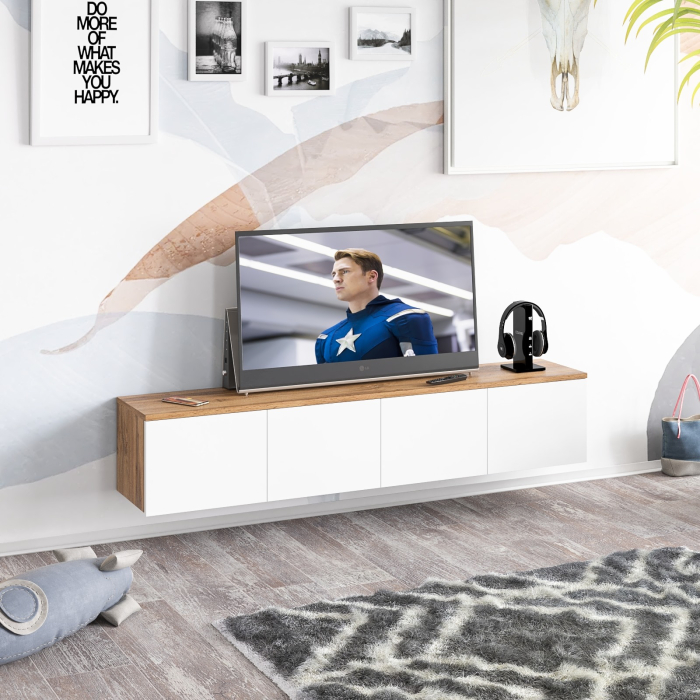 Благодаря подвесной конструкции тумба освобождает пространство на полу и визуально облегчает интерьер. В центральной части тумбы расположены два вместительных выдвижных ящика на шариковых направляющих. По бокам находятся отделения без полок, каждое скрыто за распашной дверкой. Подвесная установка позволяет не только сэкономить пространство, но и упростить уборку и прокладку кабелей. Тумба выполнена без ручек — ящики и дверцы открываются за край фасадов, подчёркивая лаконичный стиль. Монтаж осуществляется с помощью трёх надёжных угловых навесов, обеспечивающих устойчивое крепление на стене.
