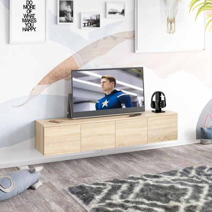 Благодаря подвесной конструкции тумба освобождает пространство на полу и визуально облегчает интерьер. В центральной части тумбы расположены два вместительных выдвижных ящика на шариковых направляющих. По бокам находятся отделения без полок, каждое скрыто за распашной дверкой. Подвесная установка позволяет не только сэкономить пространство, но и упростить уборку и прокладку кабелей. Тумба выполнена без ручек — ящики и дверцы открываются за край фасадов, подчёркивая лаконичный стиль. Монтаж осуществляется с помощью трёх надёжных угловых навесов, обеспечивающих устойчивое крепление на стене.